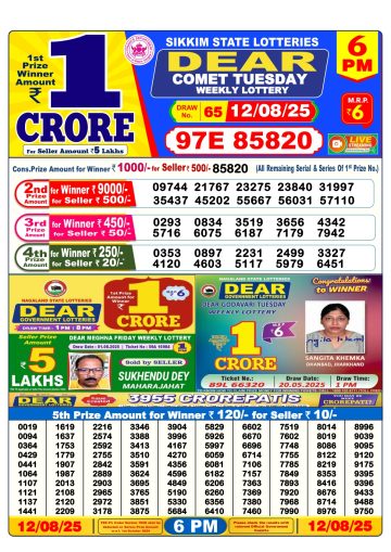 डिअर लाटरी का शाम 6 बजे का रिज़ल्ट दिनांक  12.12.25