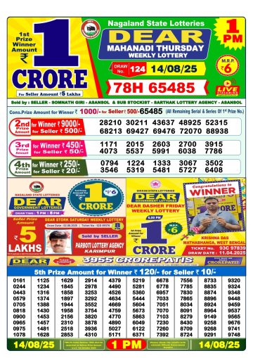 डिअर लाटरी का 1 बजे का रिज़ल्ट दिनांक 14.12.25