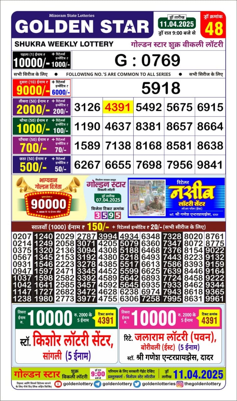 गोल्डन लाटरी का रात 9 बजे का रिज़ल्ट दिनांक 23.11.25