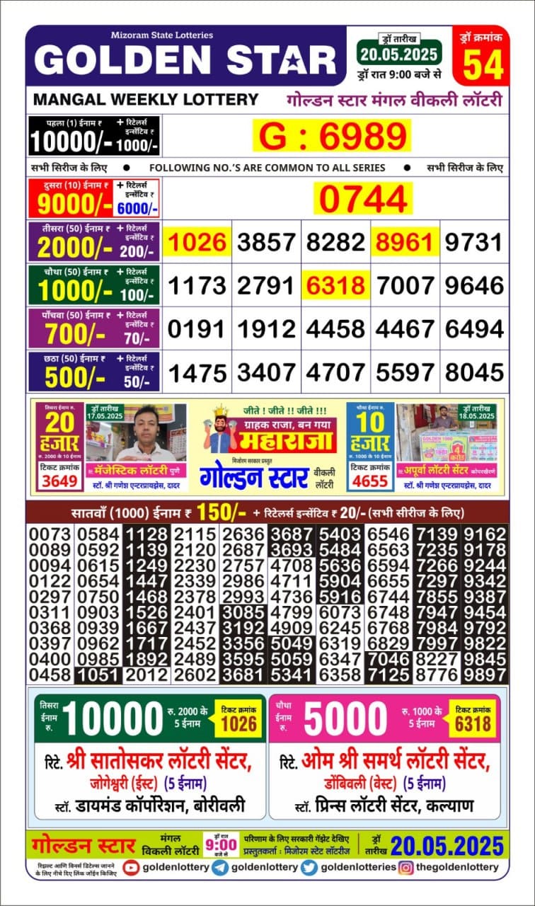 गोल्डन लाटरी का रात 9 बजे का रिज़ल्ट दिनांक 20.5.25