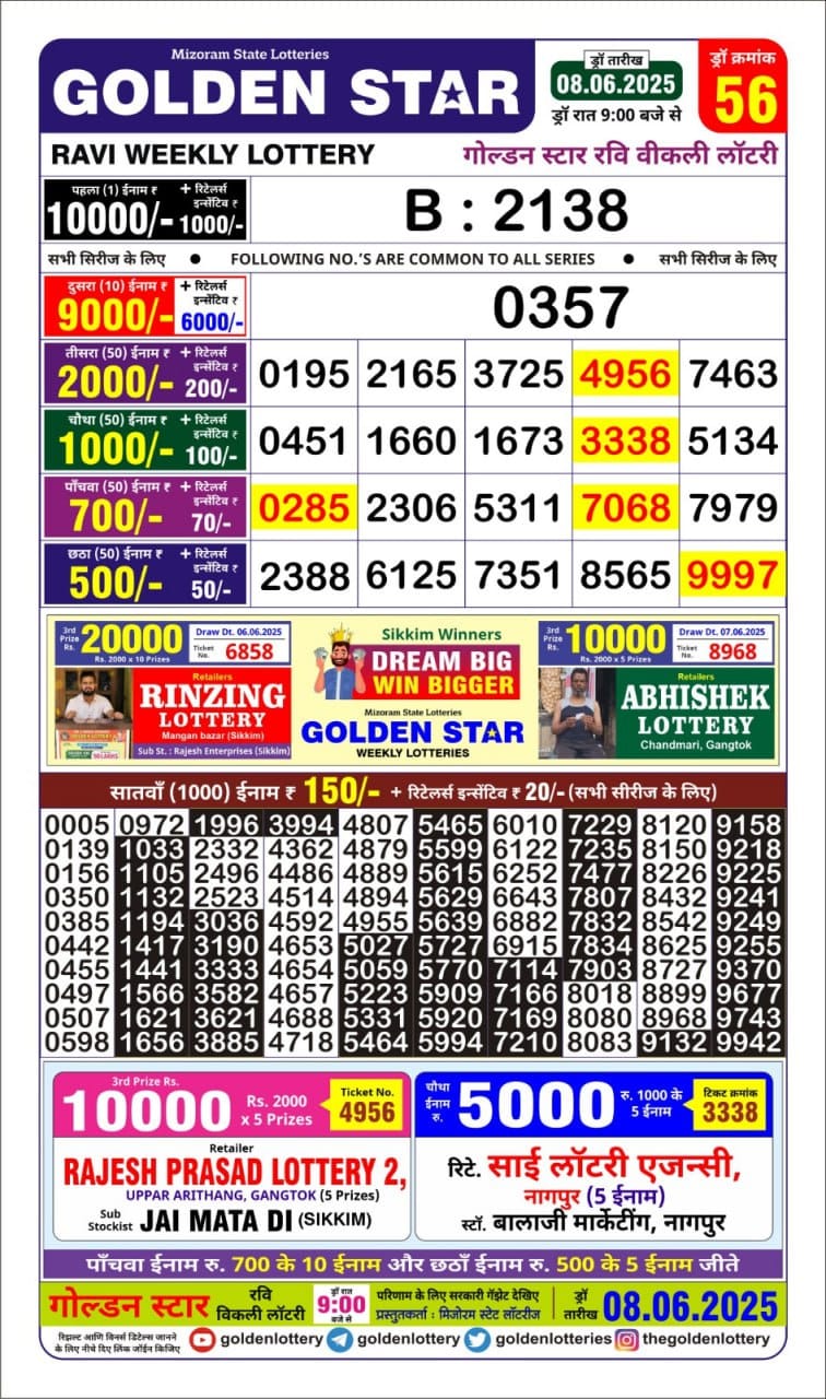 गोल्डन लाटरी का रात 9 बजे का रिज़ल्ट दिनांक 8.6.25