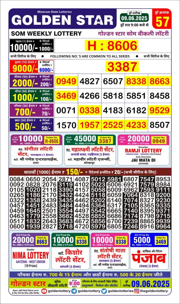 गोल्डन लाटरी का रात 9 बजे का रिज़ल्ट दिनांक 9.6.25