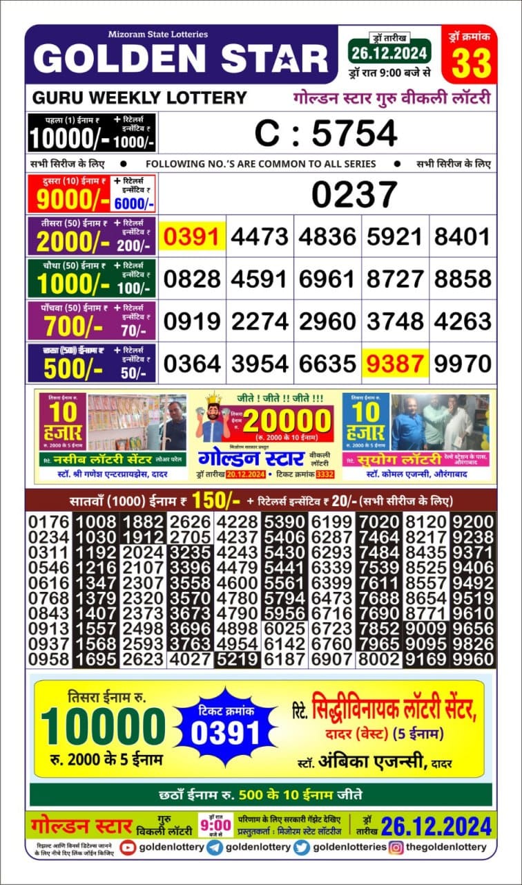 Nagaland State Lotteries was established in the year 1972 under the supervision of the Finance Department to generate a dependable source of revenue for the State Government. Nagaland State Lottery is held every day of the week at three different times of the day, Morning, Day, and Evening. Every day, the lottery is held under a different name with some difference in the prize money with the top prize worth ₹1 Crore (including Super Prize amount). The daily lotteries hosted by Nagaland State include Dear Morning Lottery, Dear Day Lottery, and Dear Evening Lottery which costs 6 Rupees for each ticket.