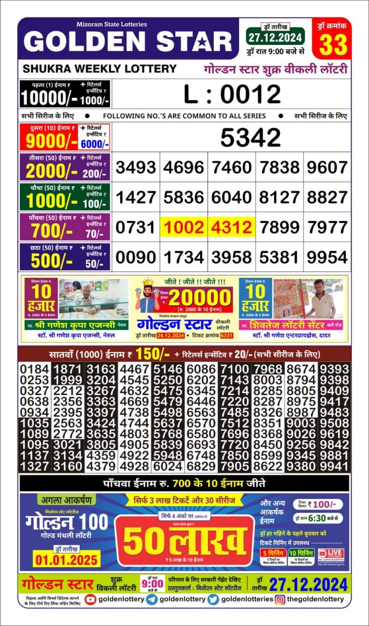 गोल्डन लाटरी का रात 9 बजे का रिज़ल्ट दिनांक 01.9.25
