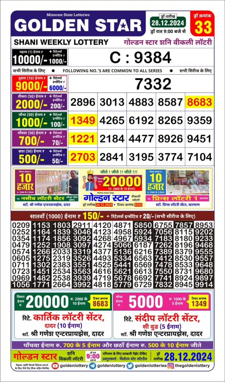 गोल्डन लाटरी का रात 9 बजे का रिज़ल्ट दिनांक 31.8.25