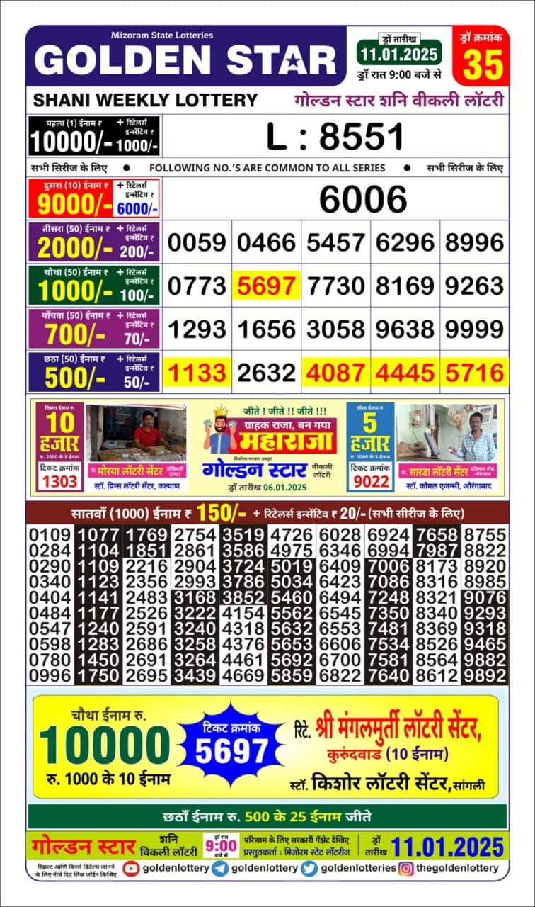 गोल्डन लाटरी का रात 9 बजे का रिज़ल्ट दिनांक 19.8.25
