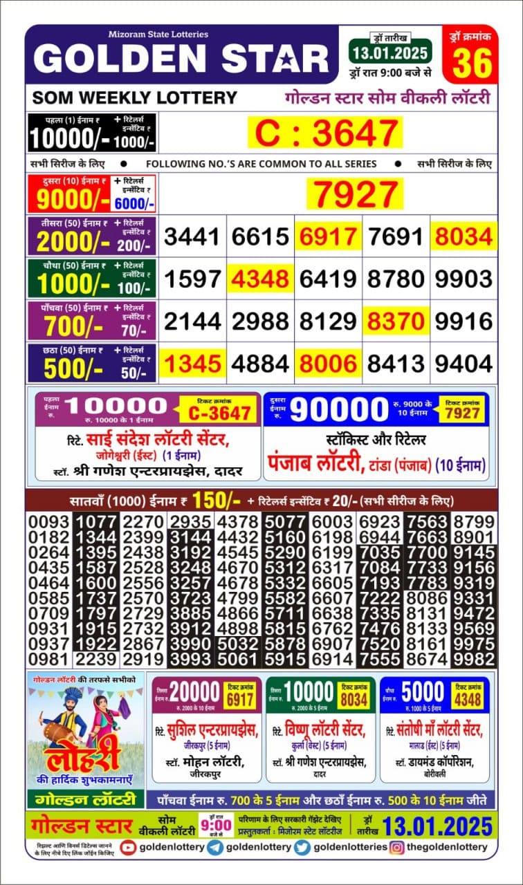 गोल्डन लाटरी का रात 9 बजे का रिज़ल्ट दिनांक 17.8.25