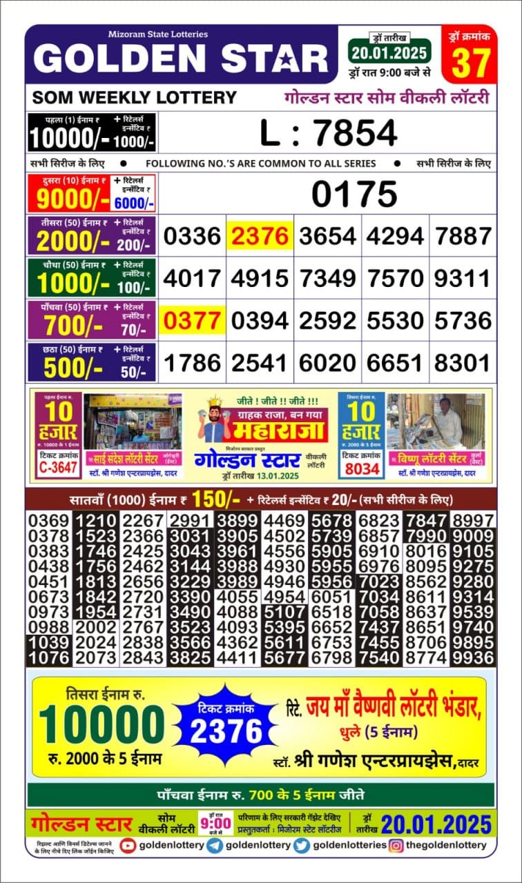 गोल्डन लाटरी का रात 9 बजे का रिज़ल्ट दिनांक 09.9.25