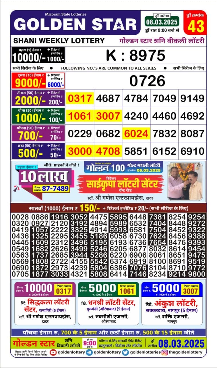 गोल्डन लाटरी का रात 9 बजे का रिज़ल्ट दिनांक 19.10.25