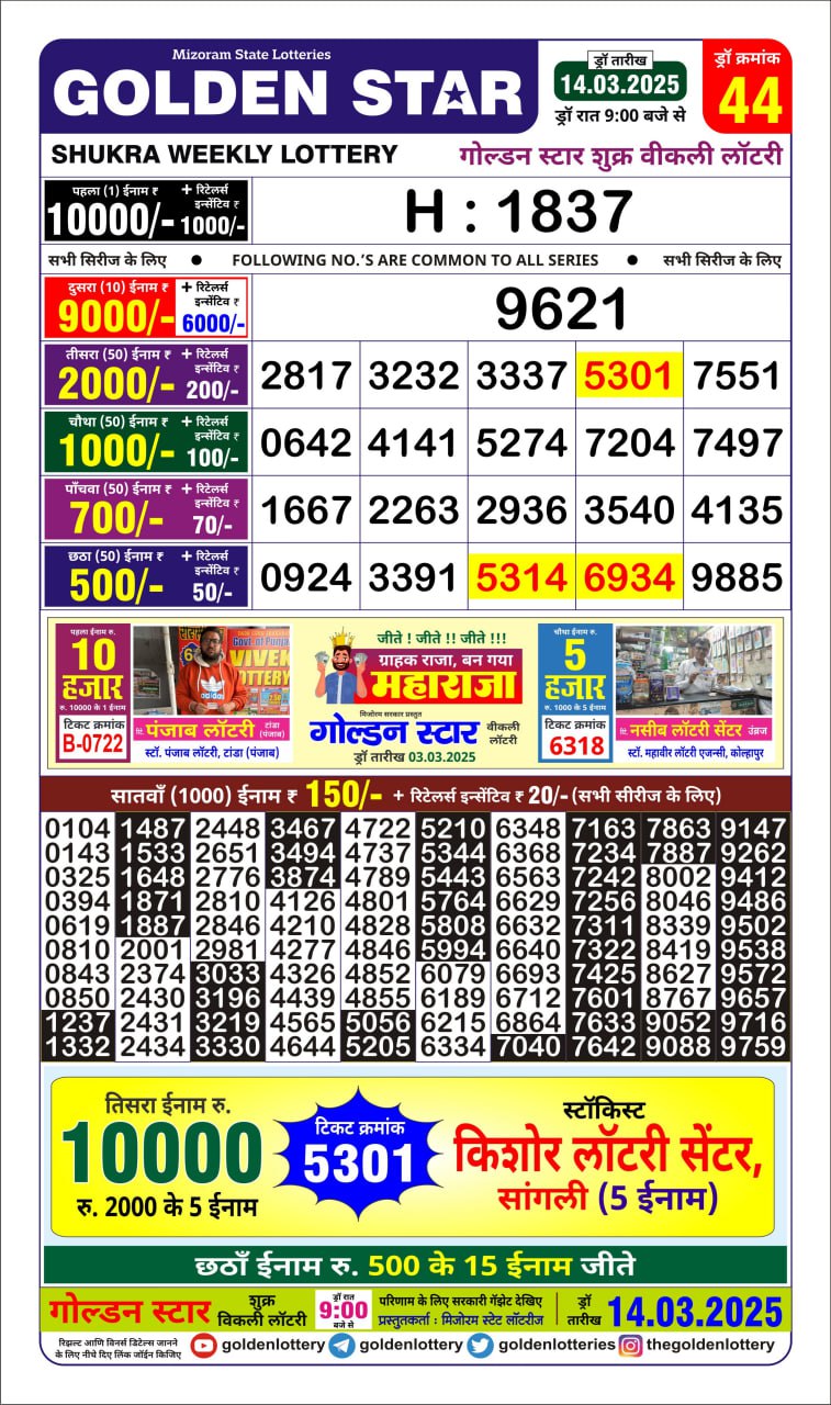 गोल्डन लाटरी का रात 9 बजे का रिज़ल्ट दिनांक 25.10.25