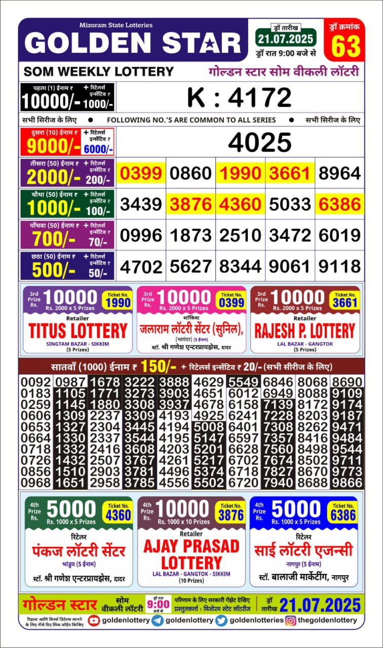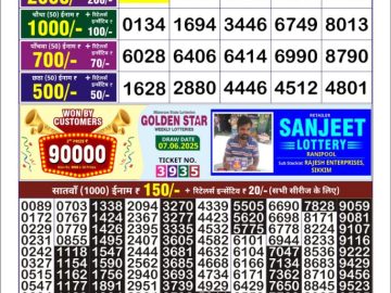 गोल्डन लाटरी का रात 9 बजे का रिज़ल्ट दिनांक 21.7.25