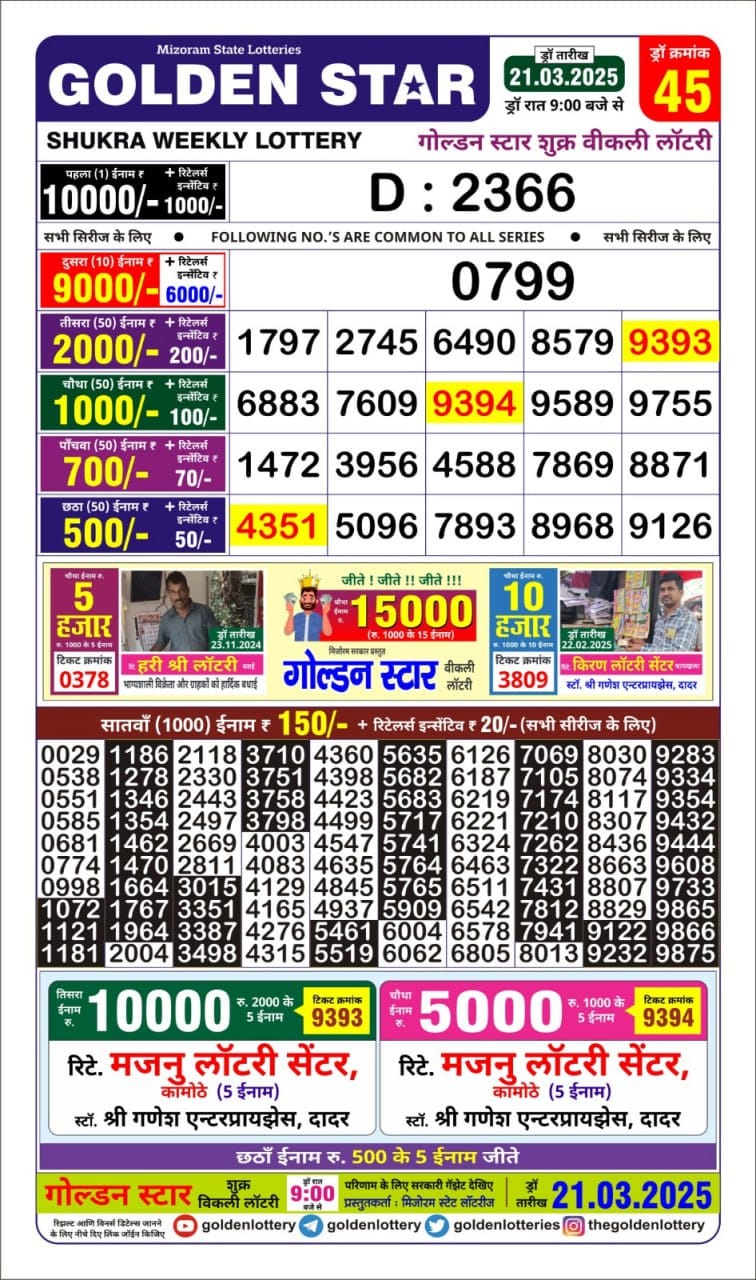 Nagaland State Lotteries was established in the year 1972 under the supervision of the Finance Department to generate a dependable source of revenue for the State Government. Nagaland State Lottery is held every day of the week at three different times of the day, Morning, Day, and Evening. Every day, the lottery is held under a different name with some difference in the prize money with the top prize worth ₹1 Crore (including Super Prize amount). The daily lotteries hosted by Nagaland State include Dear Morning Lottery, Dear Day Lottery, and Dear Evening Lottery which costs 6 Rupees for each ticket.