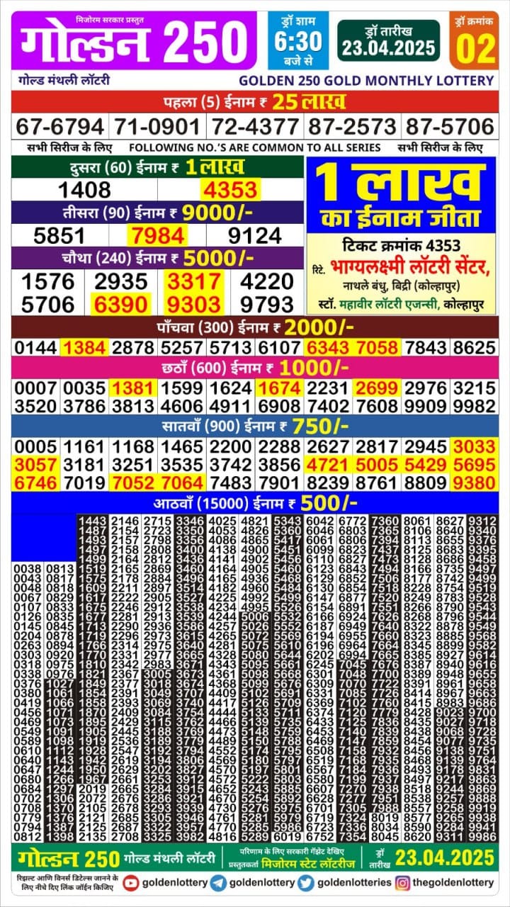 गोल्डन 250 मंथली लॉटरी रिजल्ट 27.8.25