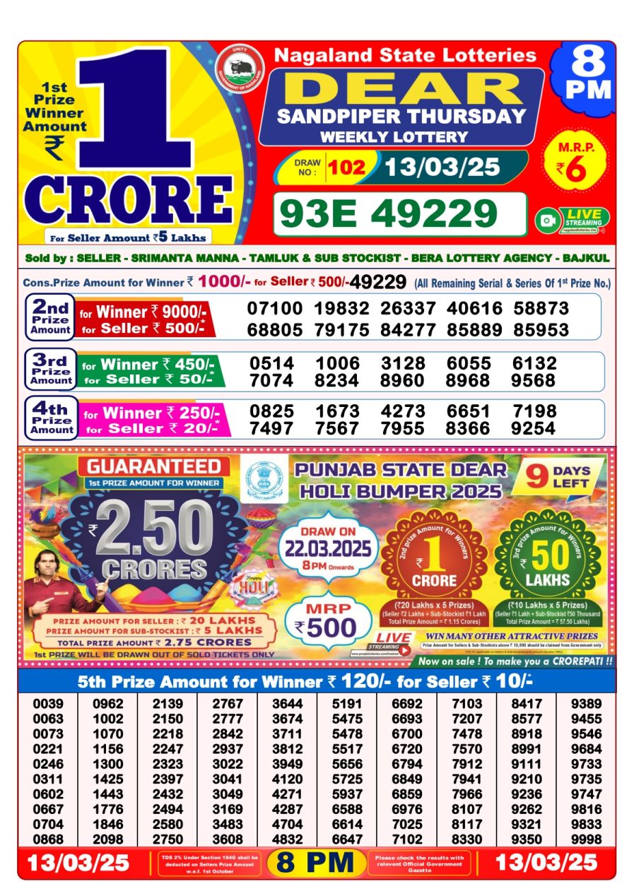 Nagaland State Lotteries was established in the year 1972 under the supervision of the Finance Department to generate a dependable source of revenue for the State Government. Nagaland State Lottery is held every day of the week at three different times of the day, Morning, Day, and Evening. Every day, the lottery is held under a different name with some difference in the prize money with the top prize worth ₹1 Crore (including Super Prize amount). The daily lotteries hosted by Nagaland State include Dear Morning Lottery, Dear Day Lottery, and Dear Evening Lottery which costs 6 Rupees for each ticket.