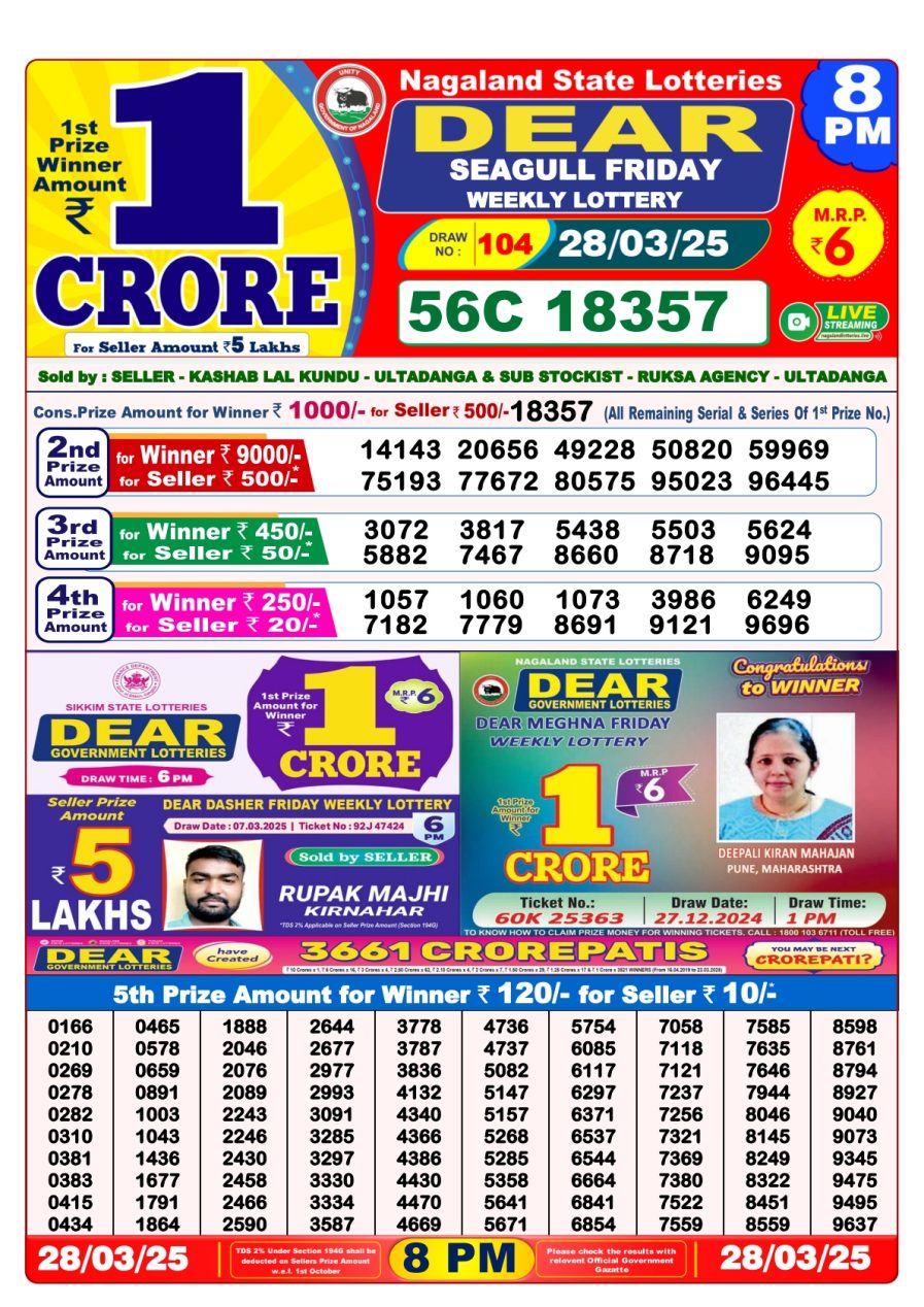 Nagaland State Lotteries was established in the year 1972 under the supervision of the Finance Department to generate a dependable source of revenue for the State Government. Nagaland State Lottery is held every day of the week at three different times of the day, Morning, Day, and Evening. Every day, the lottery is held under a different name with some difference in the prize money with the top prize worth ₹1 Crore (including Super Prize amount). The daily lotteries hosted by Nagaland State include Dear Morning Lottery, Dear Day Lottery, and Dear Evening Lottery which costs 6 Rupees for each ticket.