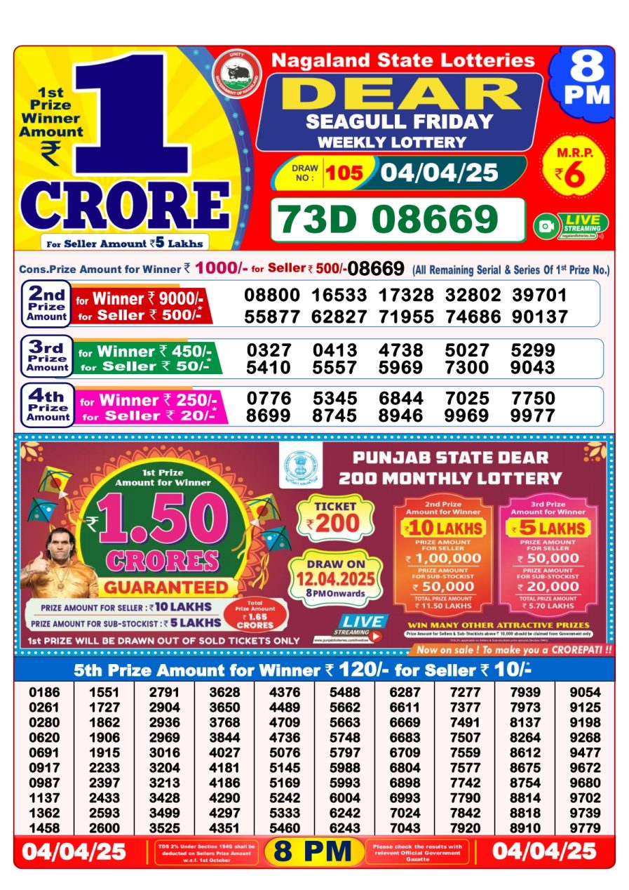 Nagaland State Lotteries was established in the year 1972 under the supervision of the Finance Department to generate a dependable source of revenue for the State Government. Nagaland State Lottery is held every day of the week at three different times of the day, Morning, Day, and Evening. Every day, the lottery is held under a different name with some difference in the prize money with the top prize worth ₹1 Crore (including Super Prize amount). The daily lotteries hosted by Nagaland State include Dear Morning Lottery, Dear Day Lottery, and Dear Evening Lottery which costs 6 Rupees for each ticket.
