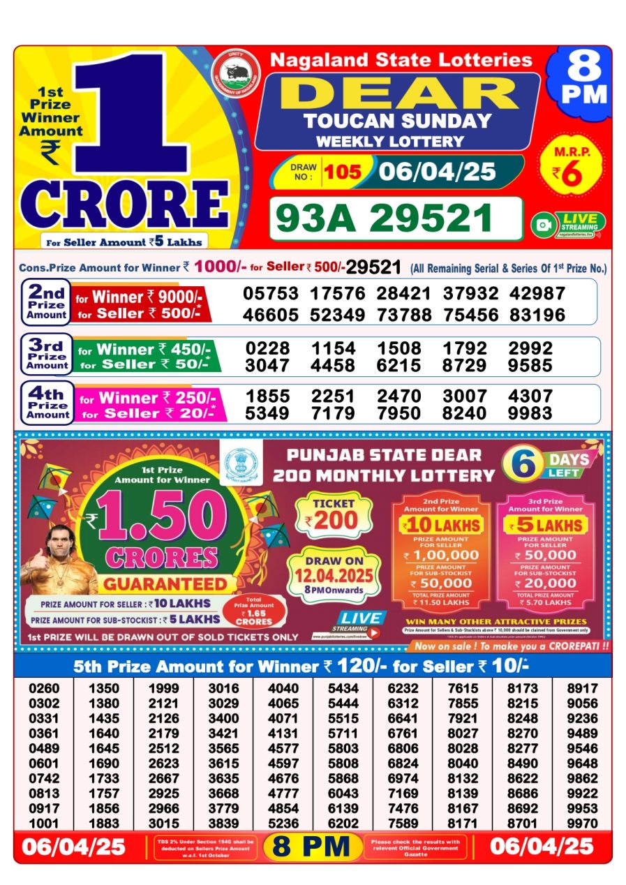 Nagaland State Lotteries was established in the year 1972 under the supervision of the Finance Department to generate a dependable source of revenue for the State Government. Nagaland State Lottery is held every day of the week at three different times of the day, Morning, Day, and Evening. Every day, the lottery is held under a different name with some difference in the prize money with the top prize worth ₹1 Crore (including Super Prize amount). The daily lotteries hosted by Nagaland State include Dear Morning Lottery, Dear Day Lottery, and Dear Evening Lottery which costs 6 Rupees for each ticket.