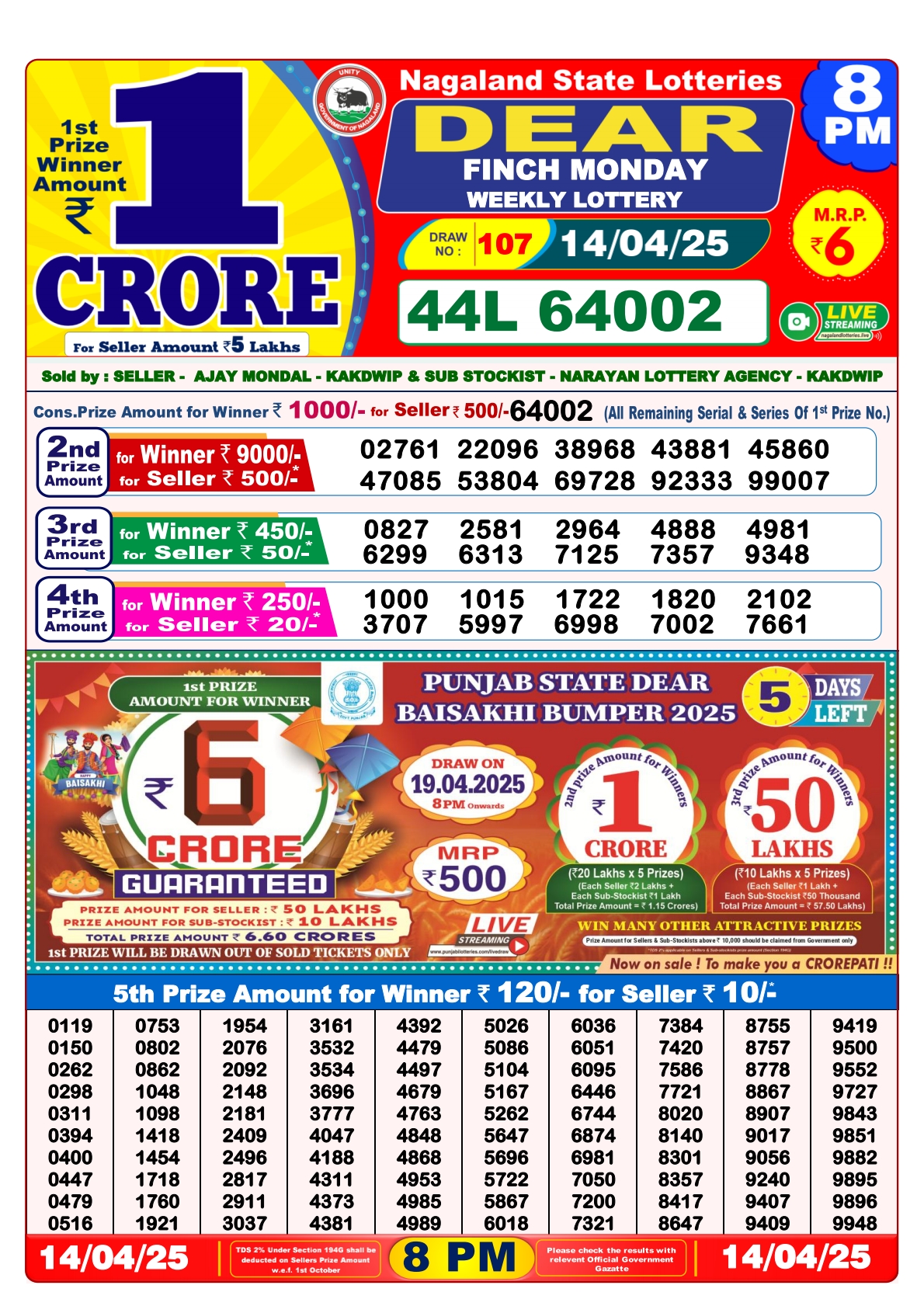 Nagaland State Lotteries was established in the year 1972 under the supervision of the Finance Department to generate a dependable source of revenue for the State Government. Nagaland State Lottery is held every day of the week at three different times of the day, Morning, Day, and Evening. Every day, the lottery is held under a different name with some difference in the prize money with the top prize worth ₹1 Crore (including Super Prize amount). The daily lotteries hosted by Nagaland State include Dear Morning Lottery, Dear Day Lottery, and Dear Evening Lottery which costs 6 Rupees for each ticket.