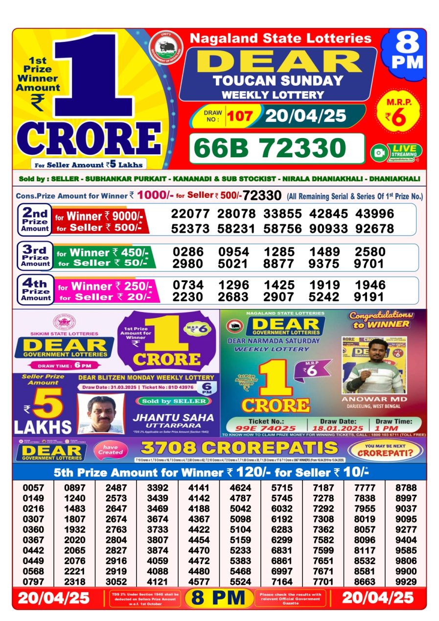 Nagaland State Lotteries was established in the year 1972 under the supervision of the Finance Department to generate a dependable source of revenue for the State Government. Nagaland State Lottery is held every day of the week at three different times of the day, Morning, Day, and Evening. Every day, the lottery is held under a different name with some difference in the prize money with the top prize worth ₹1 Crore (including Super Prize amount). The daily lotteries hosted by Nagaland State include Dear Morning Lottery, Dear Day Lottery, and Dear Evening Lottery which costs 6 Rupees for each ticket.