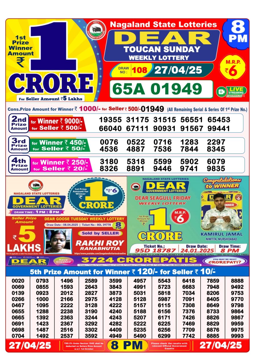 Nagaland State Lotteries was established in the year 1972 under the supervision of the Finance Department to generate a dependable source of revenue for the State Government. Nagaland State Lottery is held every day of the week at three different times of the day, Morning, Day, and Evening. Every day, the lottery is held under a different name with some difference in the prize money with the top prize worth ₹1 Crore (including Super Prize amount). The daily lotteries hosted by Nagaland State include Dear Morning Lottery, Dear Day Lottery, and Dear Evening Lottery which costs 6 Rupees for each ticket.