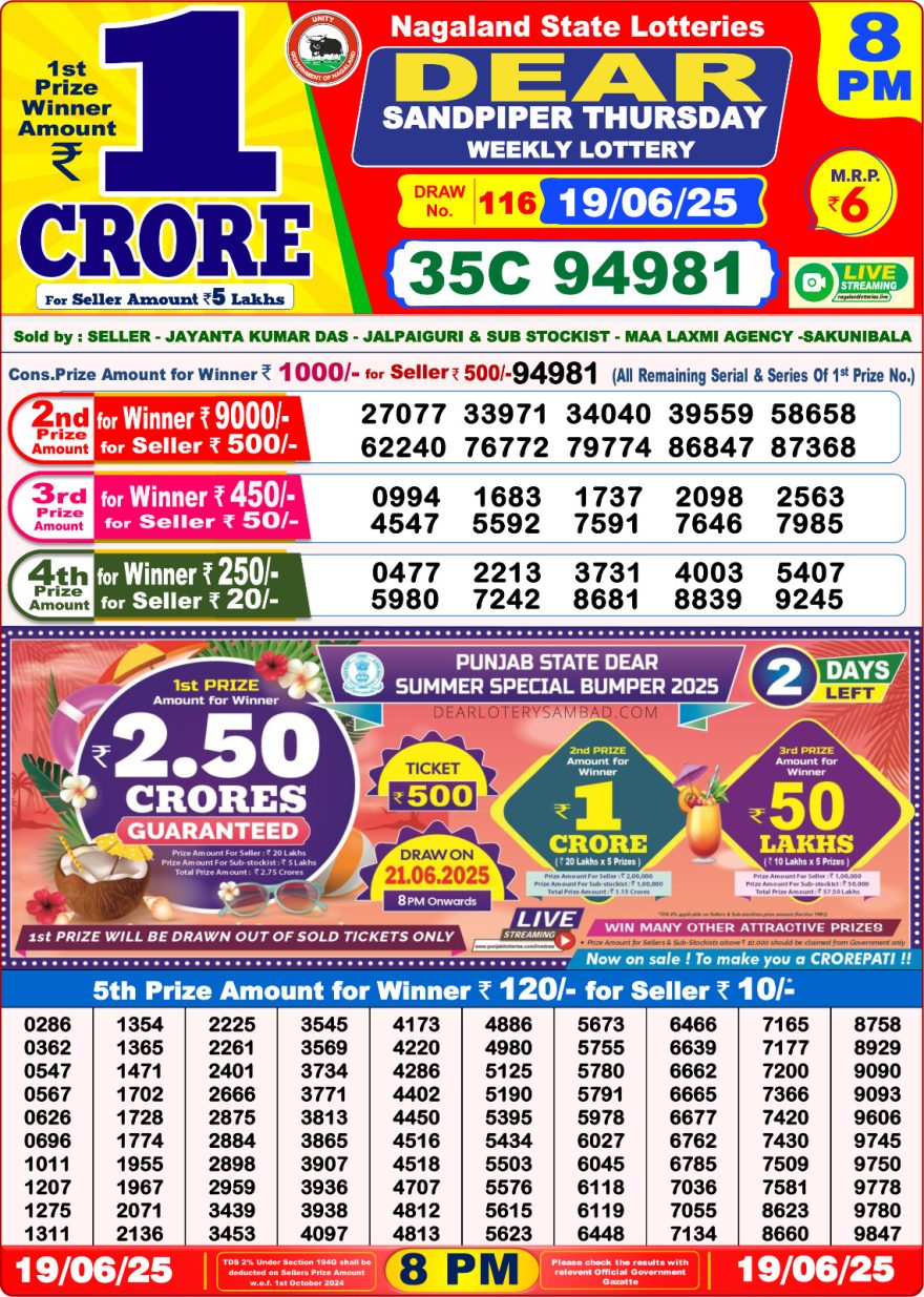 Nagaland State Lotteries was established in the year 1972 under the supervision of the Finance Department to generate a dependable source of revenue for the State Government. Nagaland State Lottery is held every day of the week at three different times of the day, Morning, Day, and Evening. Every day, the lottery is held under a different name with some difference in the prize money with the top prize worth ₹1 Crore (including Super Prize amount). The daily lotteries hosted by Nagaland State include Dear Morning Lottery, Dear Day Lottery, and Dear Evening Lottery which costs 6 Rupees for each ticket.