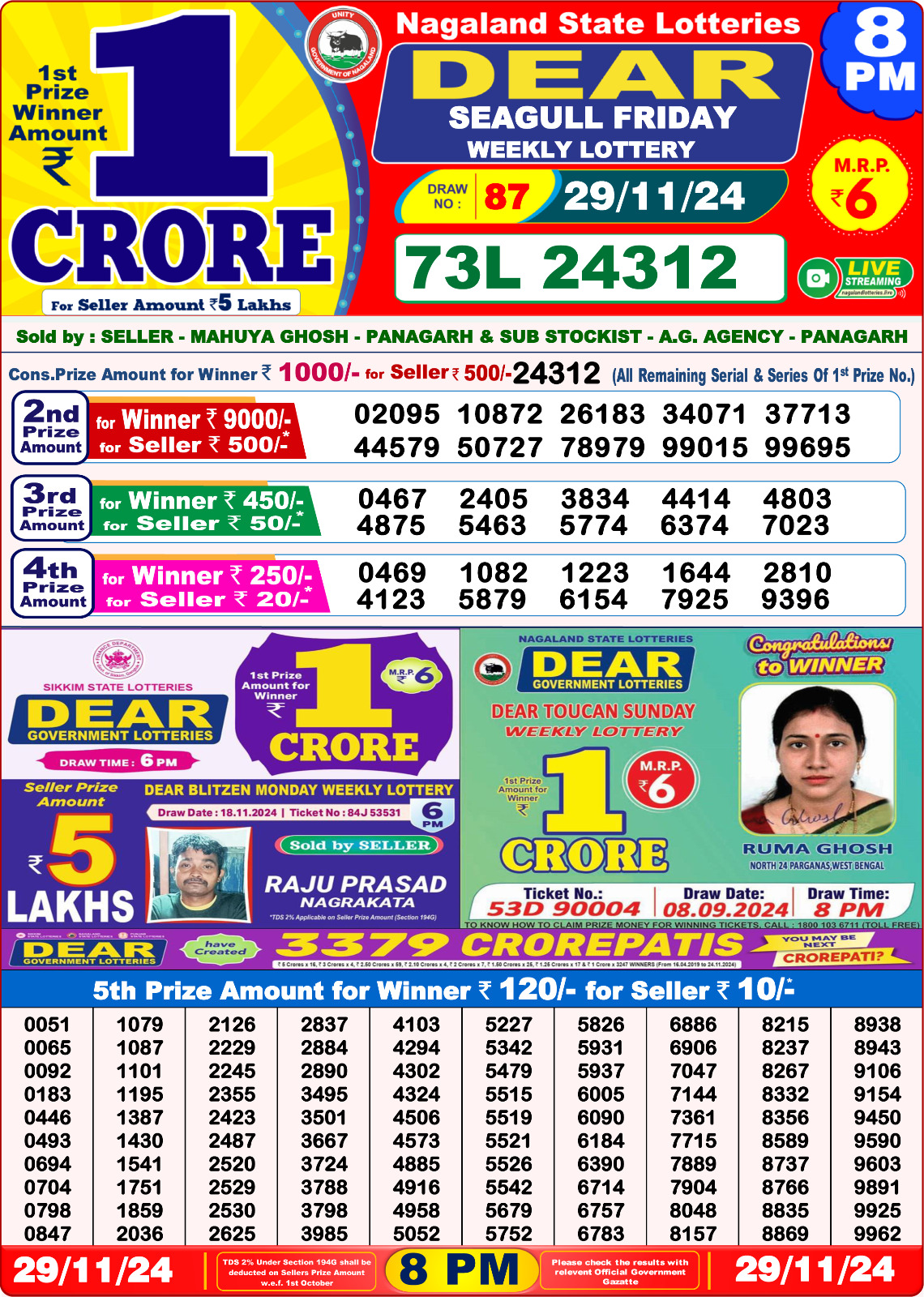 Nagaland State Lotteries was established in the year 1972 under the supervision of the Finance Department to generate a dependable source of revenue for the State Government. Nagaland State Lottery is held every day of the week at three different times of the day, Morning, Day, and Evening. Every day, the lottery is held under a different name with some difference in the prize money with the top prize worth ₹1 Crore (including Super Prize amount). The daily lotteries hosted by Nagaland State include Dear Morning Lottery, Dear Day Lottery, and Dear Evening Lottery which costs 6 Rupees for each ticket.