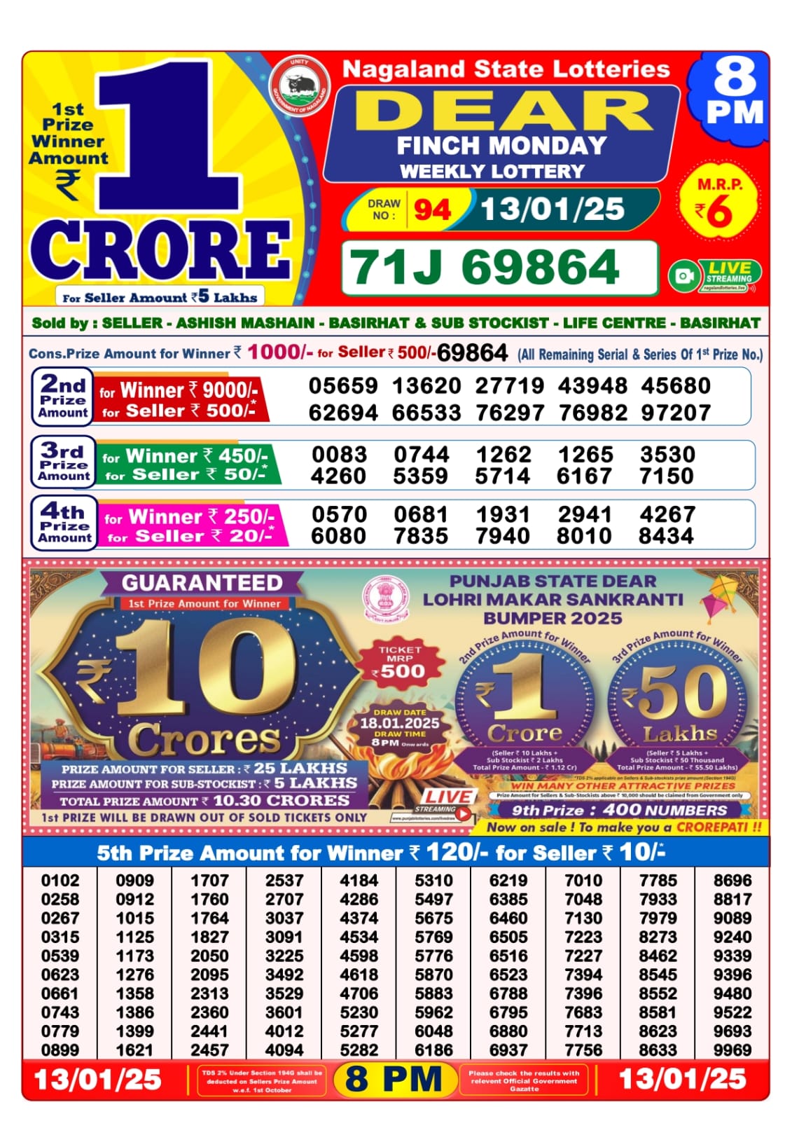 Nagaland State Lotteries was established in the year 1972 under the supervision of the Finance Department to generate a dependable source of revenue for the State Government. Nagaland State Lottery is held every day of the week at three different times of the day, Morning, Day, and Evening. Every day, the lottery is held under a different name with some difference in the prize money with the top prize worth ₹1 Crore (including Super Prize amount). The daily lotteries hosted by Nagaland State include Dear Morning Lottery, Dear Day Lottery, and Dear Evening Lottery which costs 6 Rupees for each ticket.