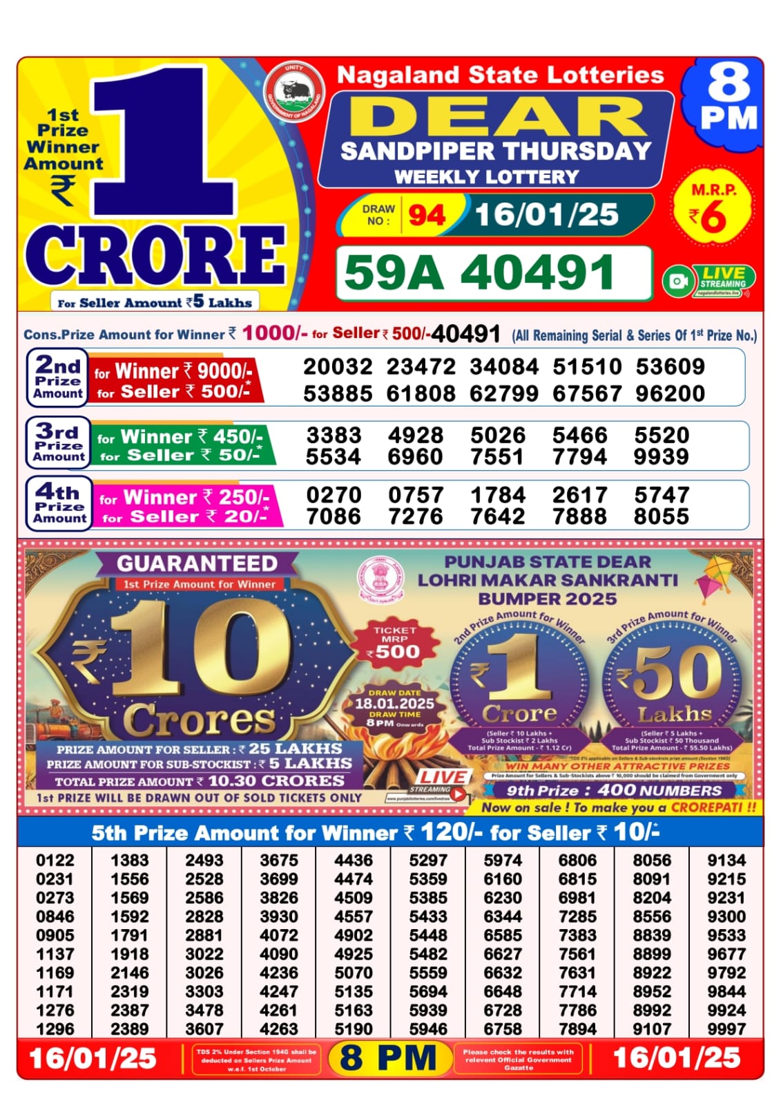 Nagaland State Lotteries was established in the year 1972 under the supervision of the Finance Department to generate a dependable source of revenue for the State Government. Nagaland State Lottery is held every day of the week at three different times of the day, Morning, Day, and Evening. Every day, the lottery is held under a different name with some difference in the prize money with the top prize worth ₹1 Crore (including Super Prize amount). The daily lotteries hosted by Nagaland State include Dear Morning Lottery, Dear Day Lottery, and Dear Evening Lottery which costs 6 Rupees for each ticket.