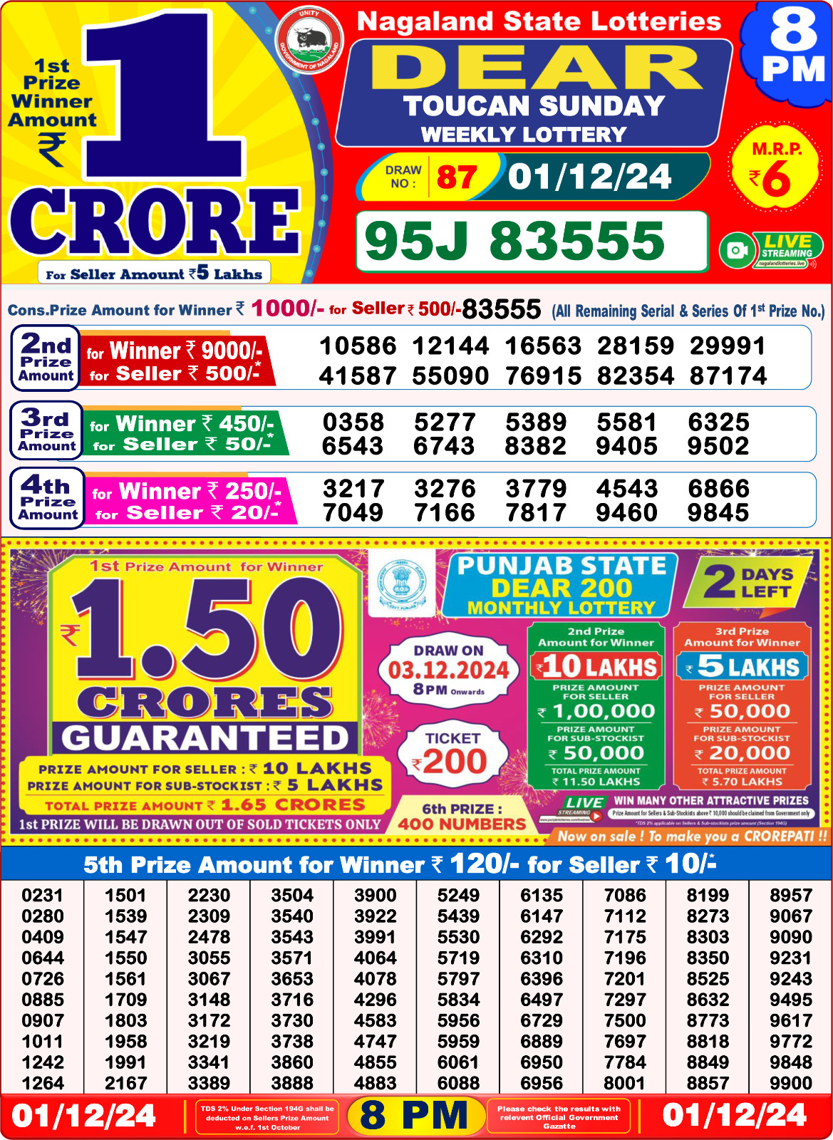 Nagaland State Lotteries was established in the year 1972 under the supervision of the Finance Department to generate a dependable source of revenue for the State Government. Nagaland State Lottery is held every day of the week at three different times of the day, Morning, Day, and Evening. Every day, the lottery is held under a different name with some difference in the prize money with the top prize worth ₹1 Crore (including Super Prize amount). The daily lotteries hosted by Nagaland State include Dear Morning Lottery, Dear Day Lottery, and Dear Evening Lottery which costs 6 Rupees for each ticket.