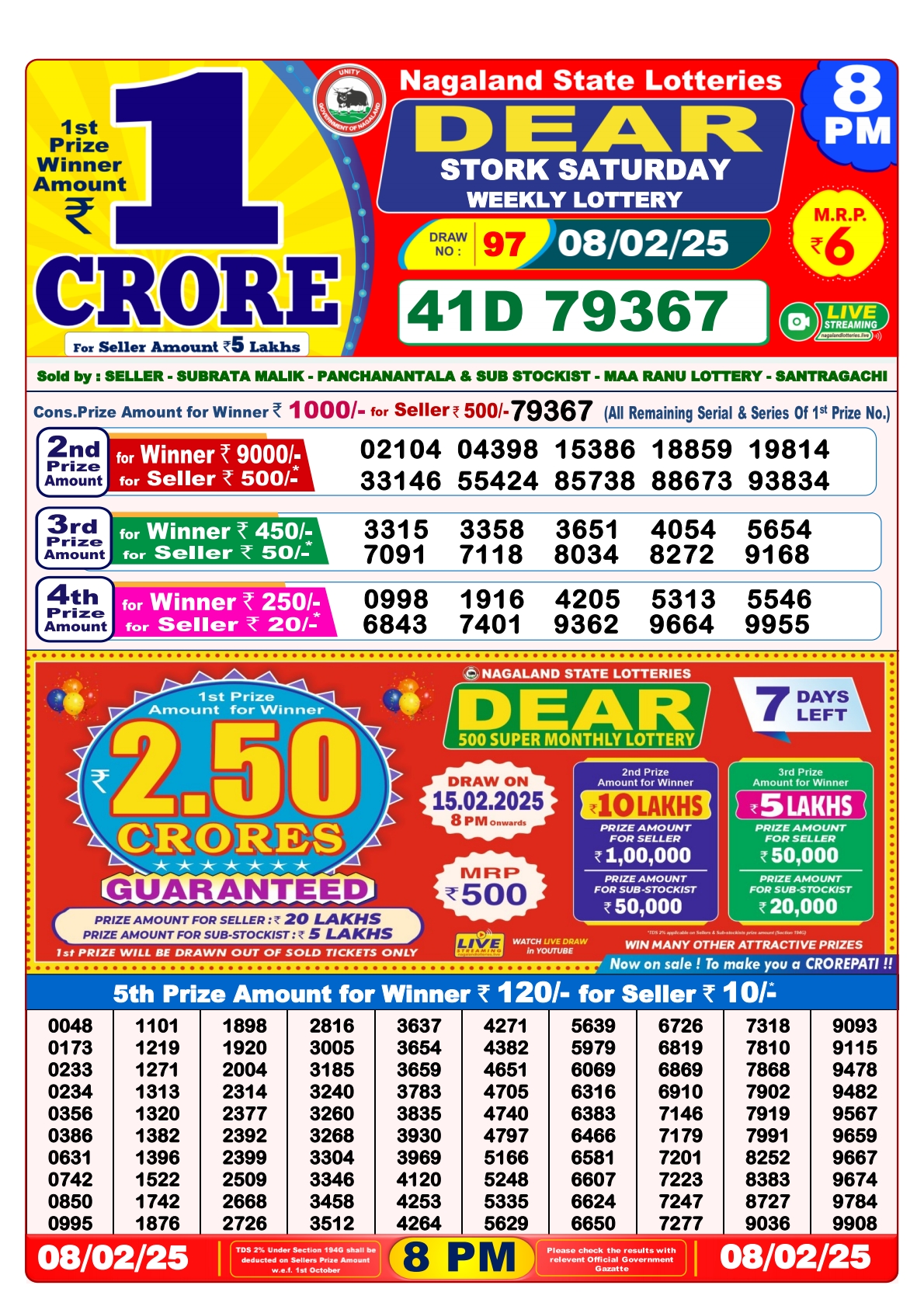 Nagaland State Lotteries was established in the year 1972 under the supervision of the Finance Department to generate a dependable source of revenue for the State Government. Nagaland State Lottery is held every day of the week at three different times of the day, Morning, Day, and Evening. Every day, the lottery is held under a different name with some difference in the prize money with the top prize worth ₹1 Crore (including Super Prize amount). The daily lotteries hosted by Nagaland State include Dear Morning Lottery, Dear Day Lottery, and Dear Evening Lottery which costs 6 Rupees for each ticket.
