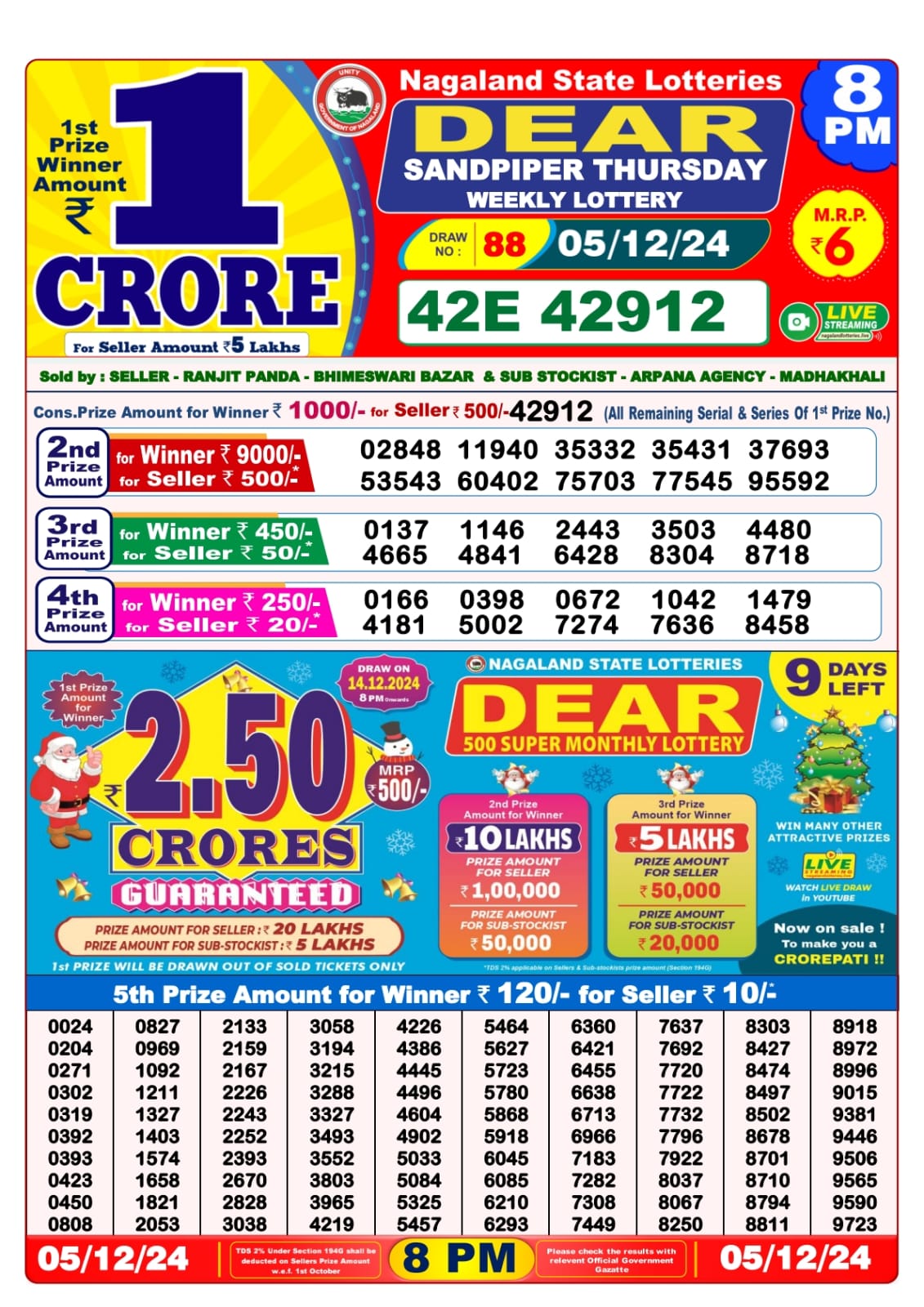 Nagaland State Lotteries was established in the year 1972 under the supervision of the Finance Department to generate a dependable source of revenue for the State Government. Nagaland State Lottery is held every day of the week at three different times of the day, Morning, Day, and Evening. Every day, the lottery is held under a different name with some difference in the prize money with the top prize worth ₹1 Crore (including Super Prize amount). The daily lotteries hosted by Nagaland State include Dear Morning Lottery, Dear Day Lottery, and Dear Evening Lottery which costs 6 Rupees for each ticket.