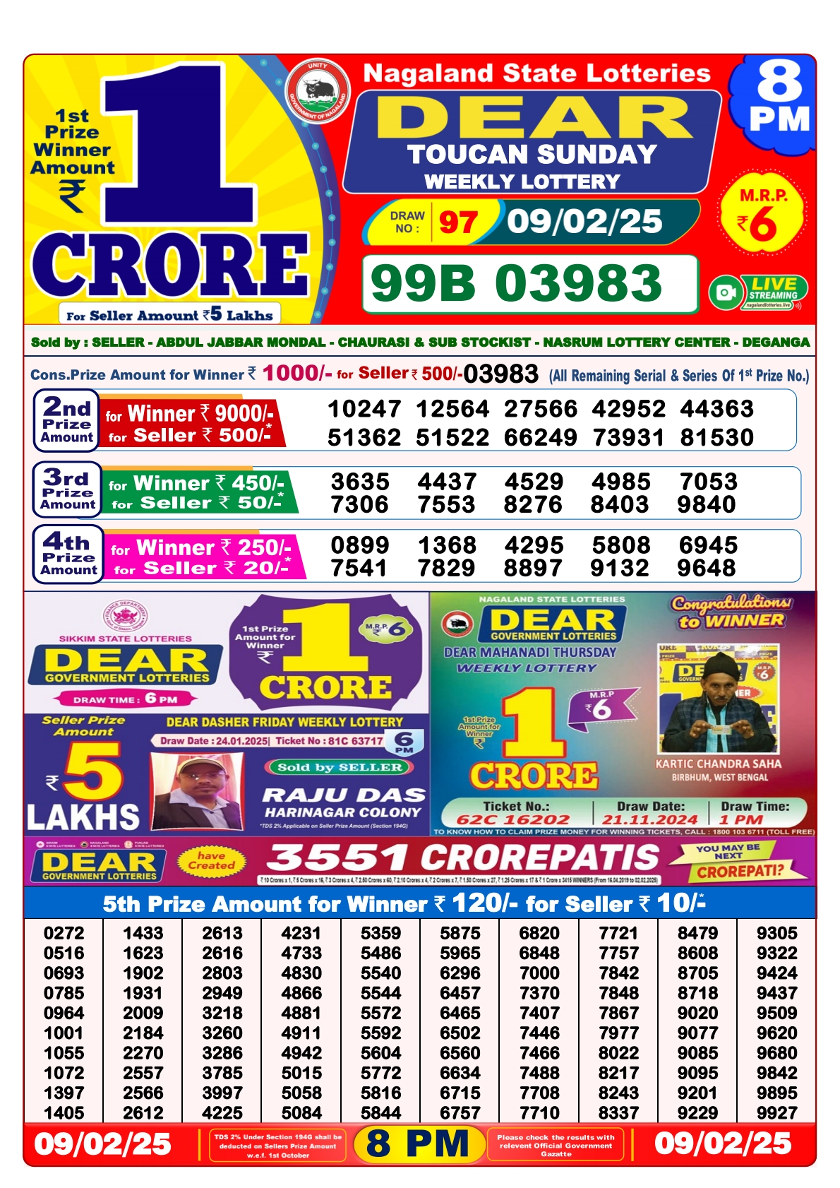Nagaland State Lotteries was established in the year 1972 under the supervision of the Finance Department to generate a dependable source of revenue for the State Government. Nagaland State Lottery is held every day of the week at three different times of the day, Morning, Day, and Evening. Every day, the lottery is held under a different name with some difference in the prize money with the top prize worth ₹1 Crore (including Super Prize amount). The daily lotteries hosted by Nagaland State include Dear Morning Lottery, Dear Day Lottery, and Dear Evening Lottery which costs 6 Rupees for each ticket.