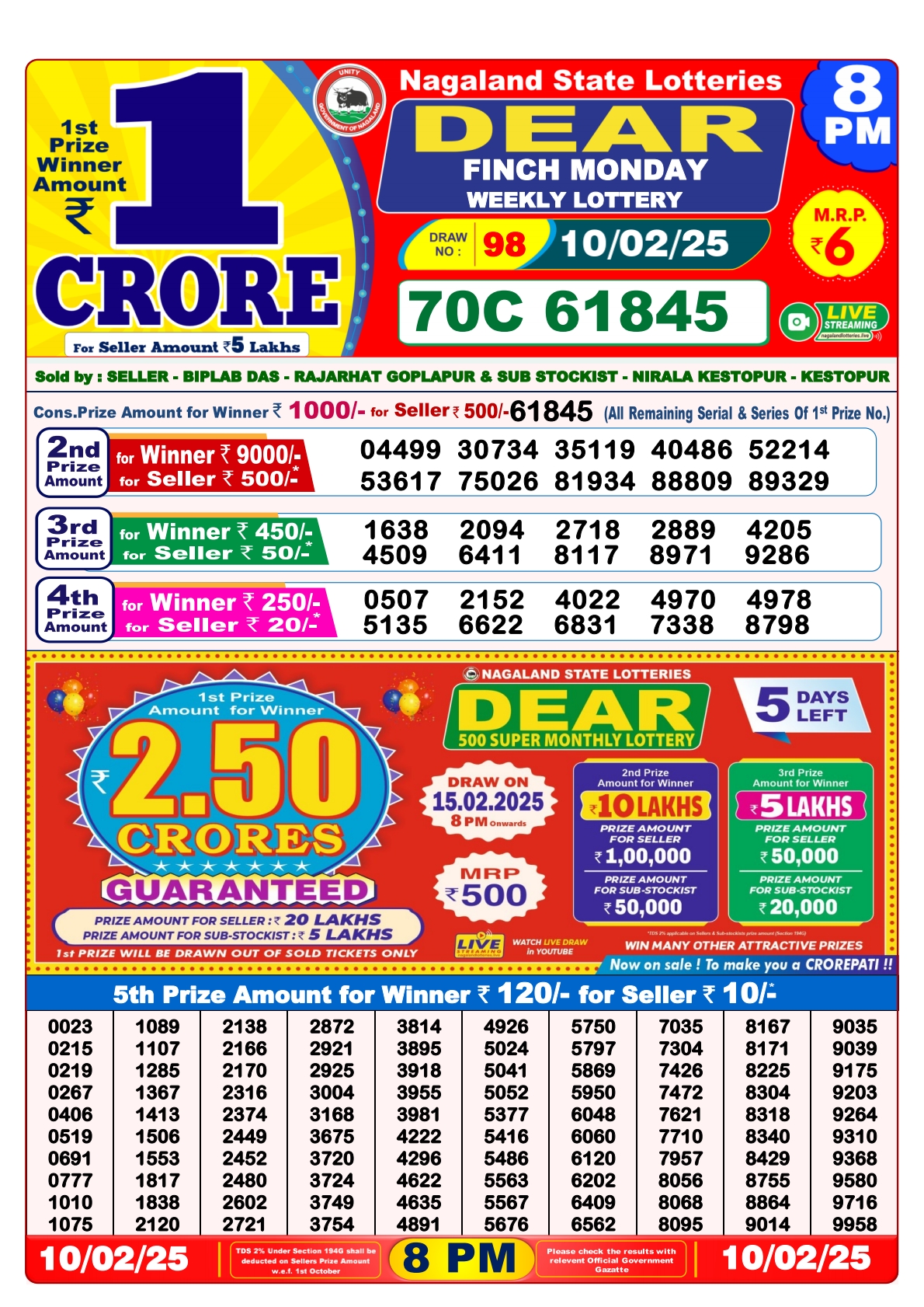 Nagaland State Lotteries was established in the year 1972 under the supervision of the Finance Department to generate a dependable source of revenue for the State Government. Nagaland State Lottery is held every day of the week at three different times of the day, Morning, Day, and Evening. Every day, the lottery is held under a different name with some difference in the prize money with the top prize worth ₹1 Crore (including Super Prize amount). The daily lotteries hosted by Nagaland State include Dear Morning Lottery, Dear Day Lottery, and Dear Evening Lottery which costs 6 Rupees for each ticket.