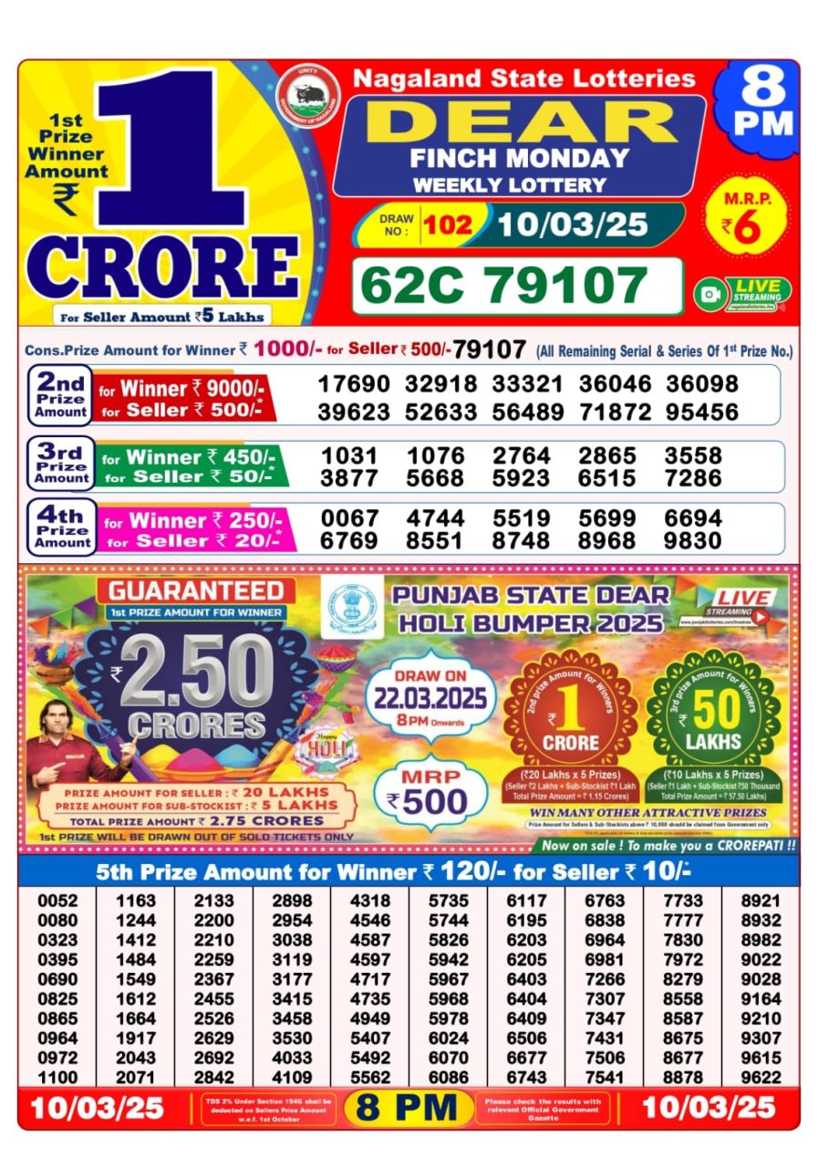 Nagaland State Lotteries was established in the year 1972 under the supervision of the Finance Department to generate a dependable source of revenue for the State Government. Nagaland State Lottery is held every day of the week at three different times of the day, Morning, Day, and Evening. Every day, the lottery is held under a different name with some difference in the prize money with the top prize worth ₹1 Crore (including Super Prize amount). The daily lotteries hosted by Nagaland State include Dear Morning Lottery, Dear Day Lottery, and Dear Evening Lottery which costs 6 Rupees for each ticket.