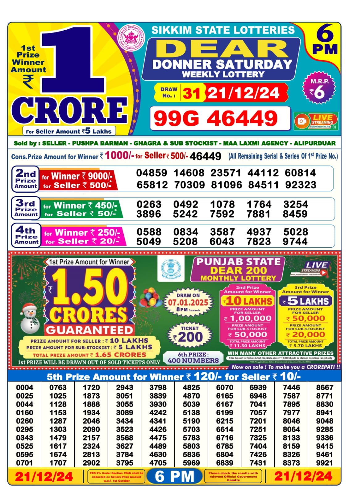 Nagaland State Lotteries was established in the year 1972 under the supervision of the Finance Department to generate a dependable source of revenue for the State Government. Nagaland State Lottery is held every day of the week at three different times of the day, Morning, Day, and Evening. Every day, the lottery is held under a different name with some difference in the prize money with the top prize worth ₹1 Crore (including Super Prize amount). The daily lotteries hosted by Nagaland State include Dear Morning Lottery, Dear Day Lottery, and Dear Evening Lottery which costs 6 Rupees for each ticket.