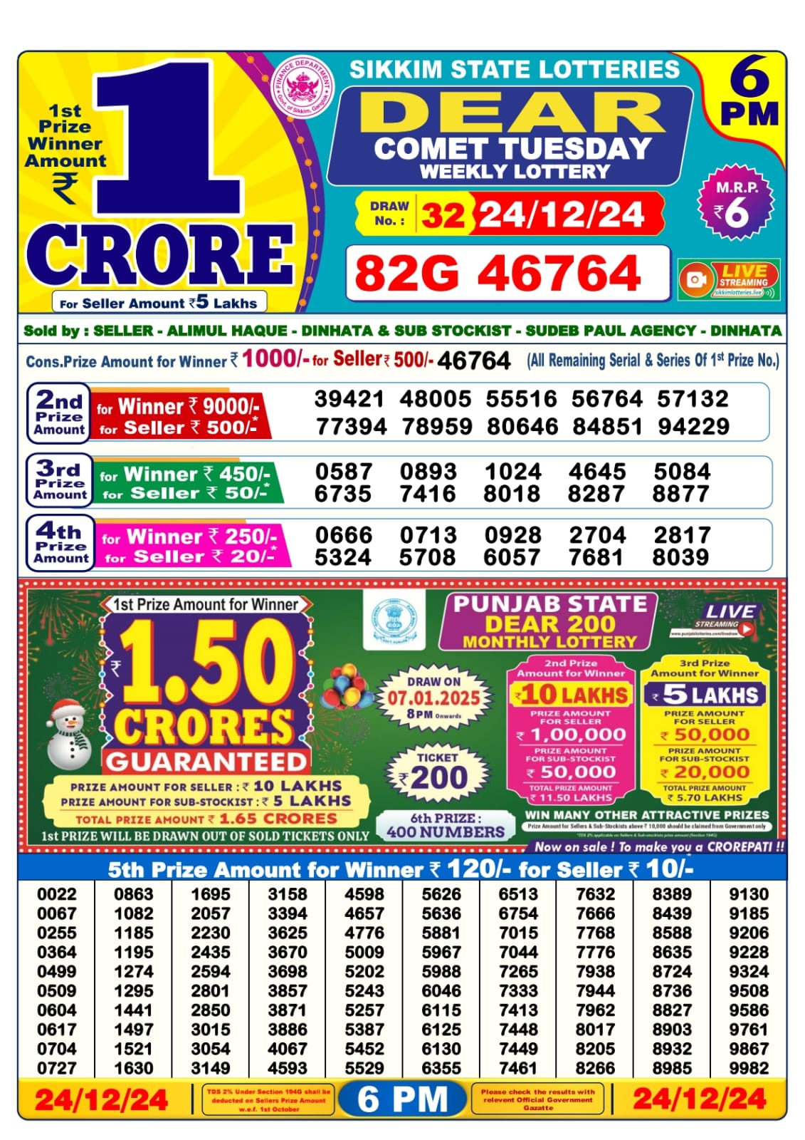 Nagaland State Lotteries was established in the year 1972 under the supervision of the Finance Department to generate a dependable source of revenue for the State Government. Nagaland State Lottery is held every day of the week at three different times of the day, Morning, Day, and Evening. Every day, the lottery is held under a different name with some difference in the prize money with the top prize worth ₹1 Crore (including Super Prize amount). The daily lotteries hosted by Nagaland State include Dear Morning Lottery, Dear Day Lottery, and Dear Evening Lottery which costs 6 Rupees for each ticket.