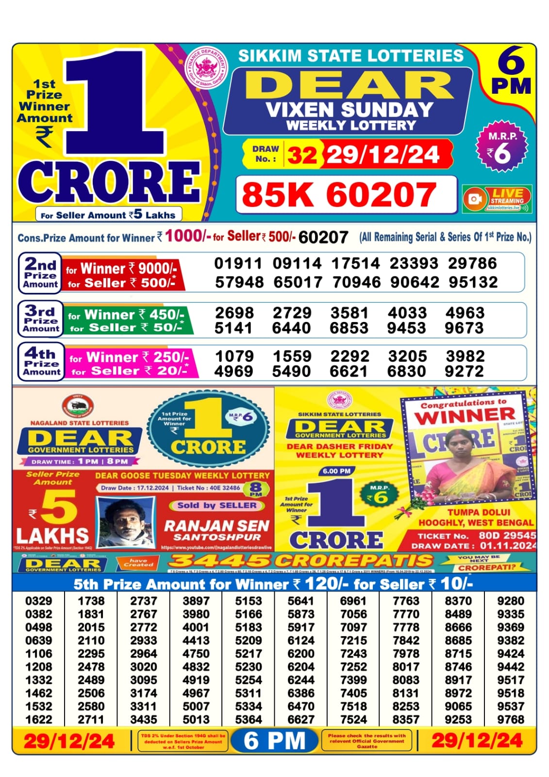 Nagaland State Lotteries was established in the year 1972 under the supervision of the Finance Department to generate a dependable source of revenue for the State Government. Nagaland State Lottery is held every day of the week at three different times of the day, Morning, Day, and Evening. Every day, the lottery is held under a different name with some difference in the prize money with the top prize worth ₹1 Crore (including Super Prize amount). The daily lotteries hosted by Nagaland State include Dear Morning Lottery, Dear Day Lottery, and Dear Evening Lottery which costs 6 Rupees for each ticket.