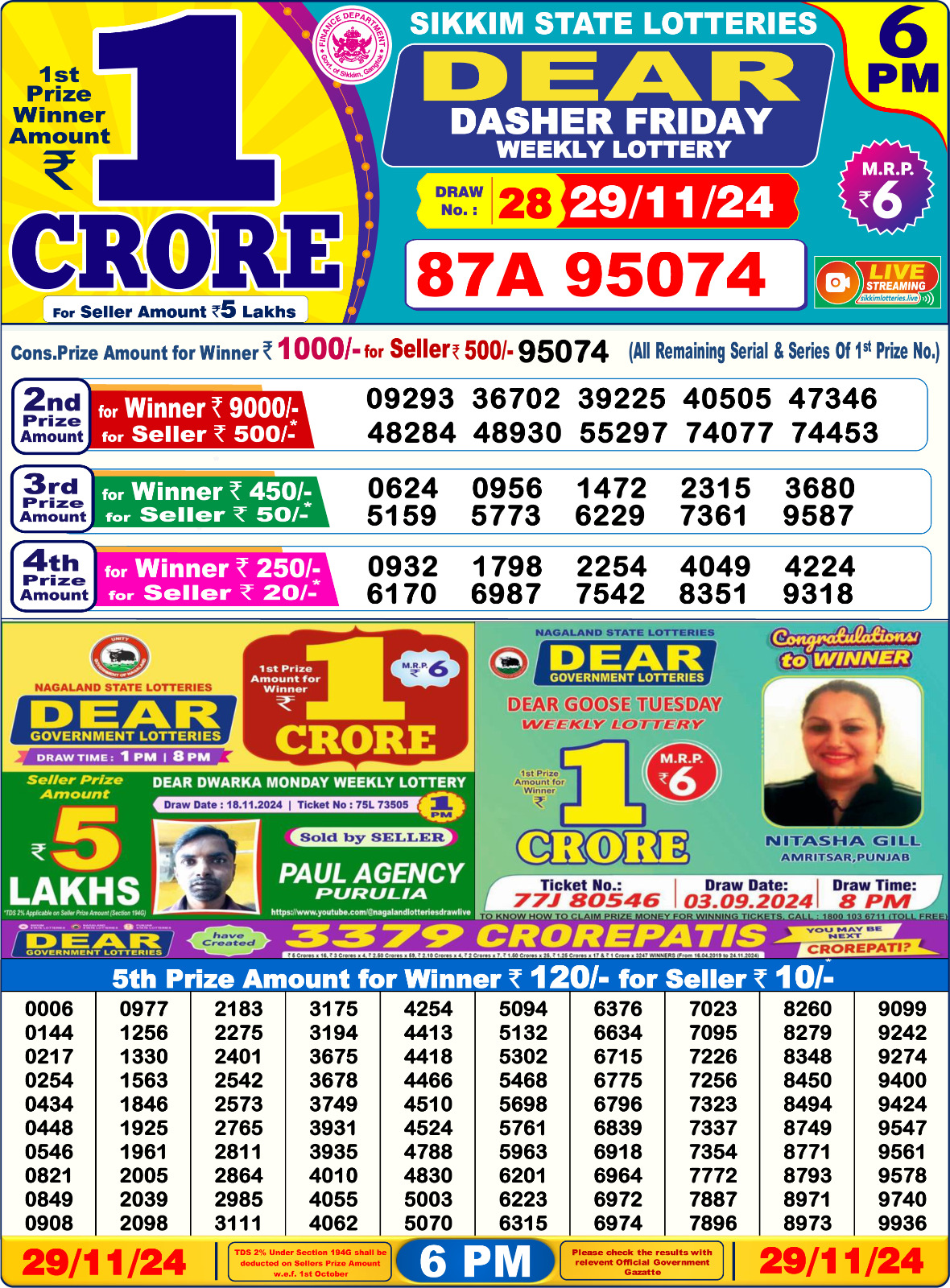 Nagaland State Lotteries was established in the year 1972 under the supervision of the Finance Department to generate a dependable source of revenue for the State Government. Nagaland State Lottery is held every day of the week at three different times of the day, Morning, Day, and Evening. Every day, the lottery is held under a different name with some difference in the prize money with the top prize worth ₹1 Crore (including Super Prize amount). The daily lotteries hosted by Nagaland State include Dear Morning Lottery, Dear Day Lottery, and Dear Evening Lottery which costs 6 Rupees for each ticket.