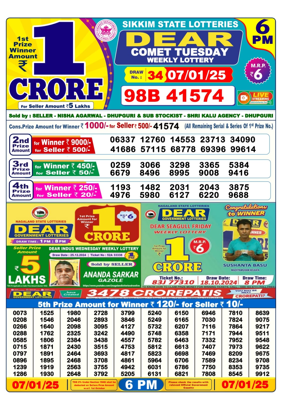 Nagaland State Lotteries was established in the year 1972 under the supervision of the Finance Department to generate a dependable source of revenue for the State Government. Nagaland State Lottery is held every day of the week at three different times of the day, Morning, Day, and Evening. Every day, the lottery is held under a different name with some difference in the prize money with the top prize worth ₹1 Crore (including Super Prize amount). The daily lotteries hosted by Nagaland State include Dear Morning Lottery, Dear Day Lottery, and Dear Evening Lottery which costs 6 Rupees for each ticket.