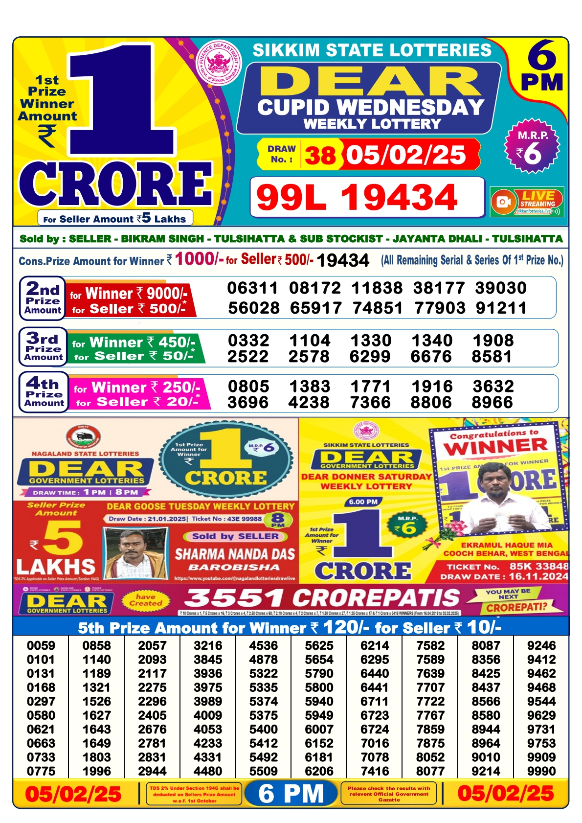 Nagaland State Lotteries was established in the year 1972 under the supervision of the Finance Department to generate a dependable source of revenue for the State Government. Nagaland State Lottery is held every day of the week at three different times of the day, Morning, Day, and Evening. Every day, the lottery is held under a different name with some difference in the prize money with the top prize worth ₹1 Crore (including Super Prize amount). The daily lotteries hosted by Nagaland State include Dear Morning Lottery, Dear Day Lottery, and Dear Evening Lottery which costs 6 Rupees for each ticket.