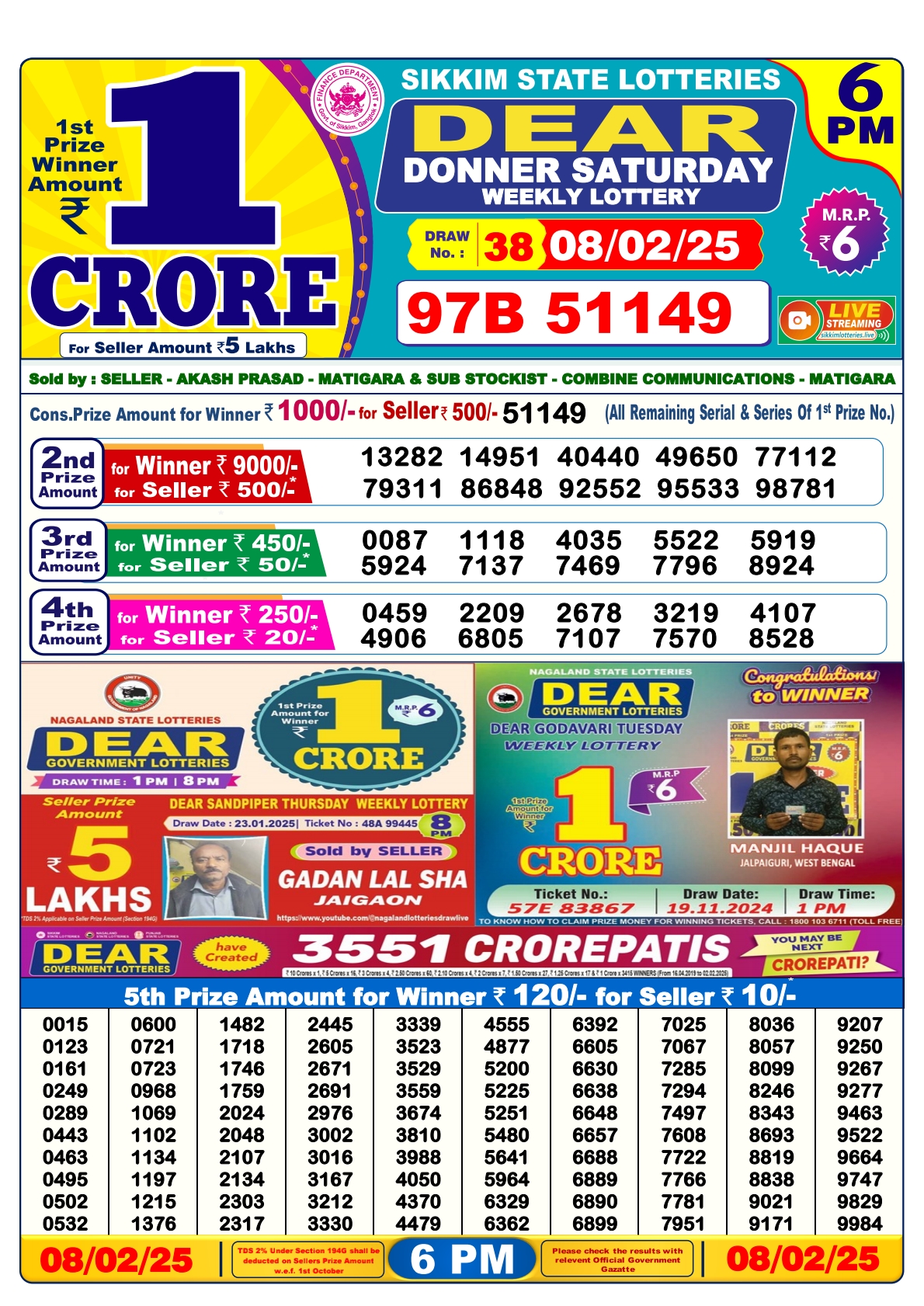 Nagaland State Lotteries was established in the year 1972 under the supervision of the Finance Department to generate a dependable source of revenue for the State Government. Nagaland State Lottery is held every day of the week at three different times of the day, Morning, Day, and Evening. Every day, the lottery is held under a different name with some difference in the prize money with the top prize worth ₹1 Crore (including Super Prize amount). The daily lotteries hosted by Nagaland State include Dear Morning Lottery, Dear Day Lottery, and Dear Evening Lottery which costs 6 Rupees for each ticket.