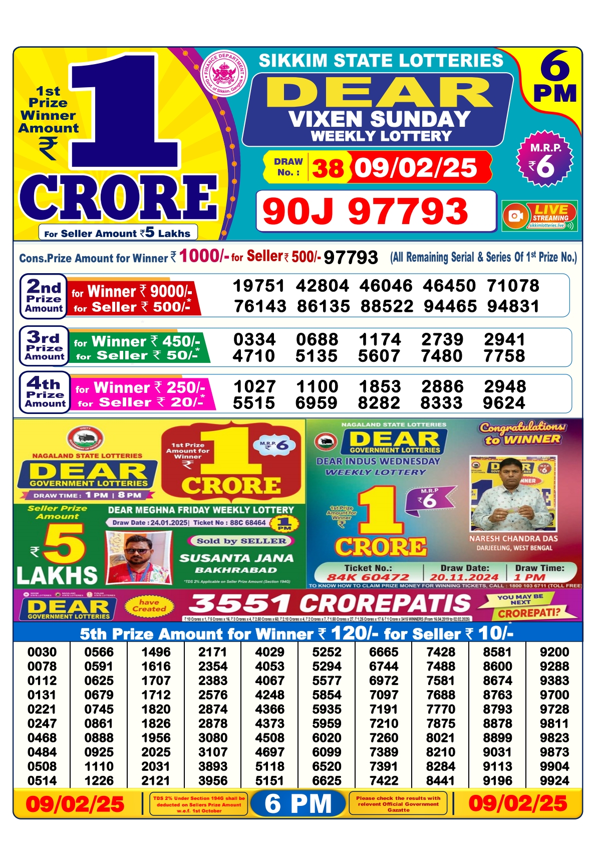 डिअर लाटरी का शाम 6 बजे का रिज़ल्ट दिनांक 26.9.25