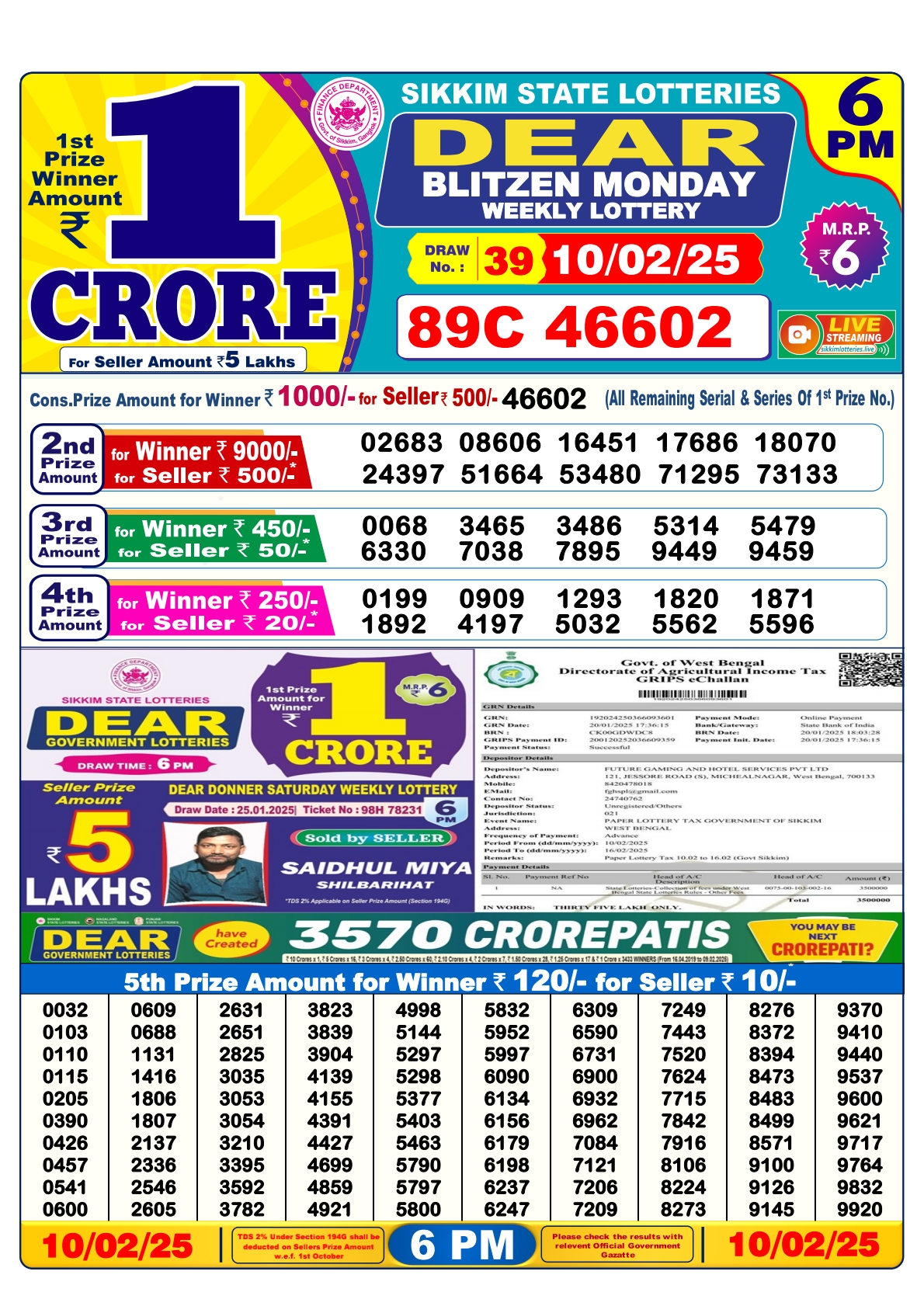 डिअर लाटरी का शाम 6 बजे का रिज़ल्ट दिनांक 27.9.25