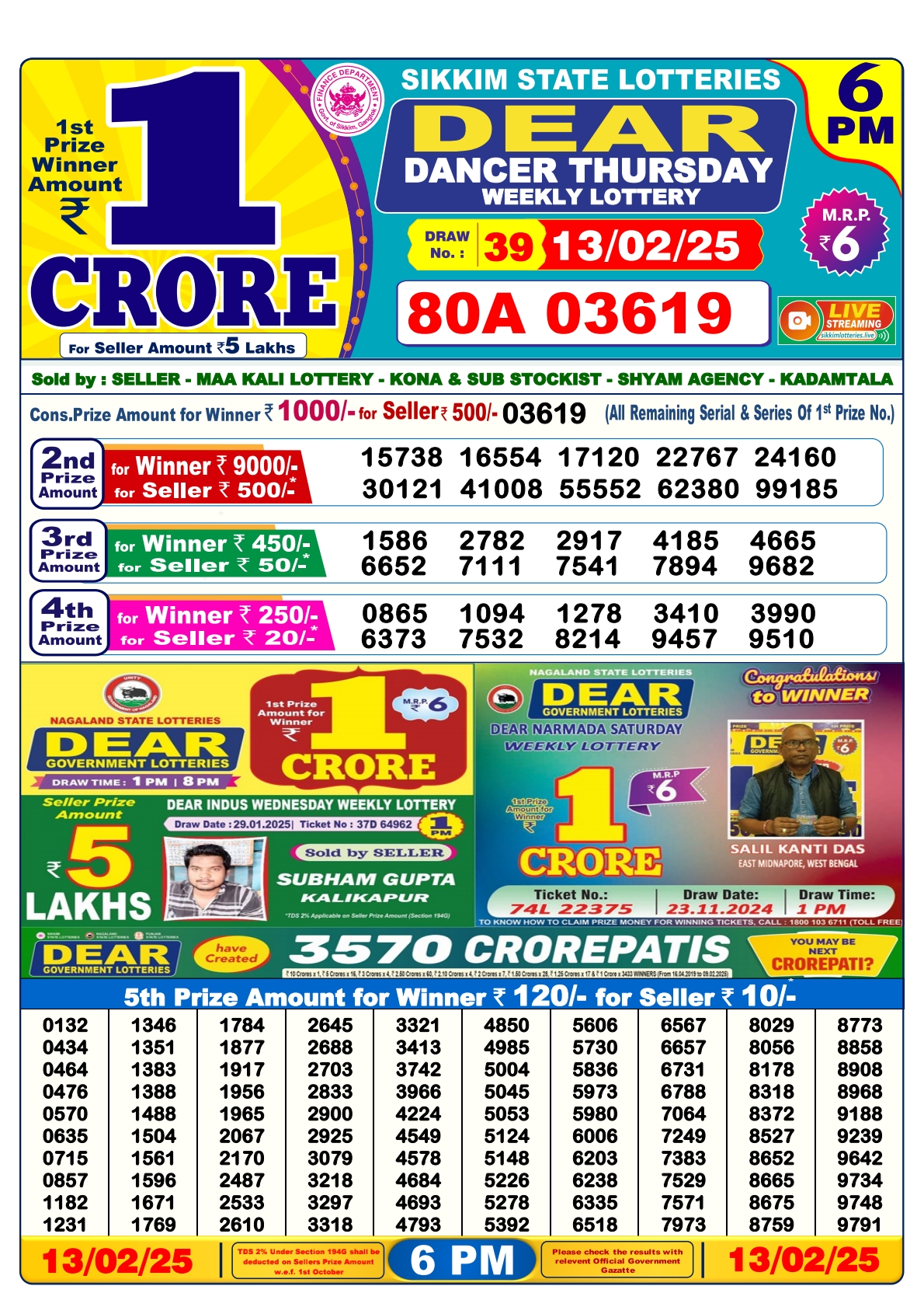 डिअर लाटरी का शाम 6 बजे का रिज़ल्ट दिनांक  03.10.25
