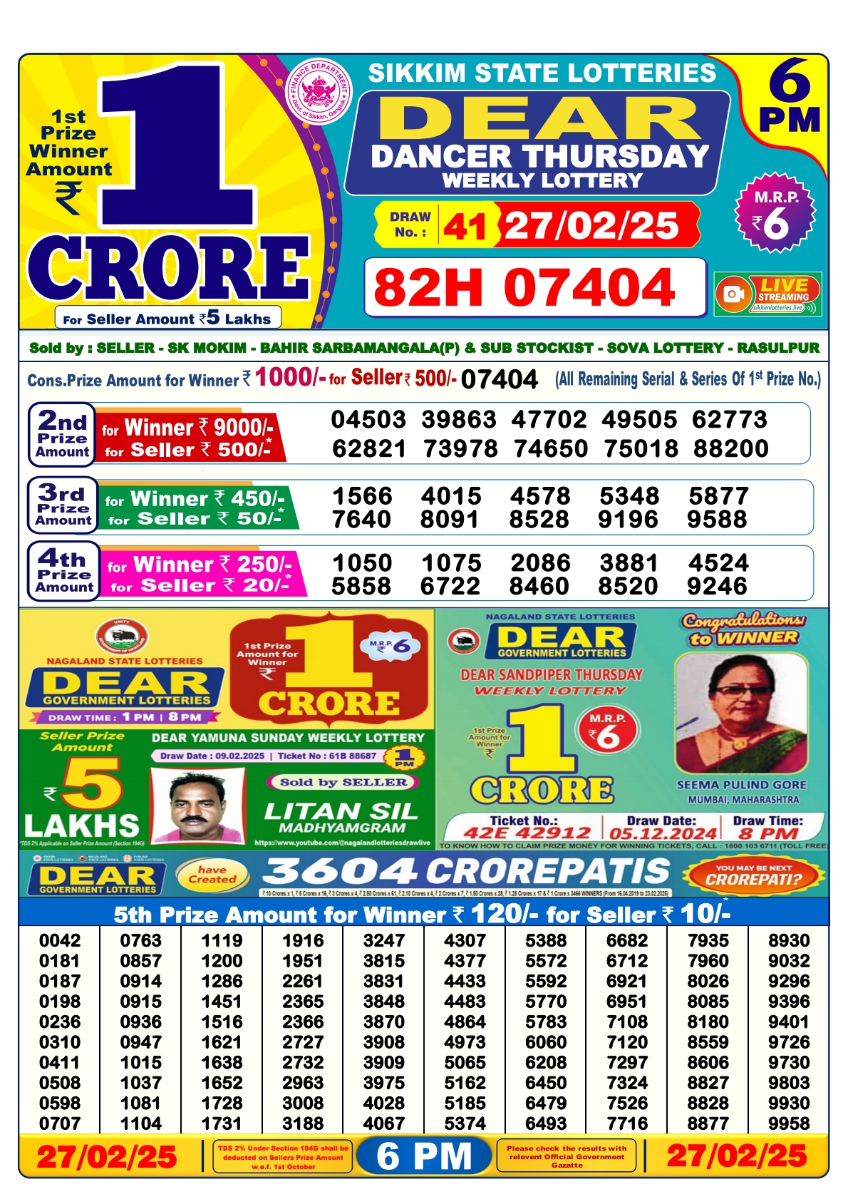 डिअर लाटरी का शाम 6 बजे का रिज़ल्ट दिनांक  17.10.25