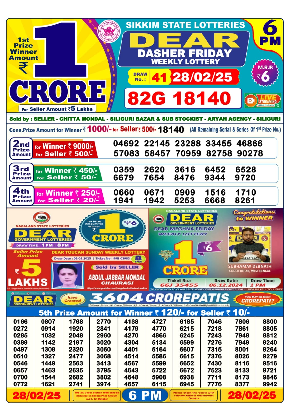 Nagaland State Lotteries was established in the year 1972 under the supervision of the Finance Department to generate a dependable source of revenue for the State Government. Nagaland State Lottery is held every day of the week at three different times of the day, Morning, Day, and Evening. Every day, the lottery is held under a different name with some difference in the prize money with the top prize worth ₹1 Crore (including Super Prize amount). The daily lotteries hosted by Nagaland State include Dear Morning Lottery, Dear Day Lottery, and Dear Evening Lottery which costs 6 Rupees for each ticket.