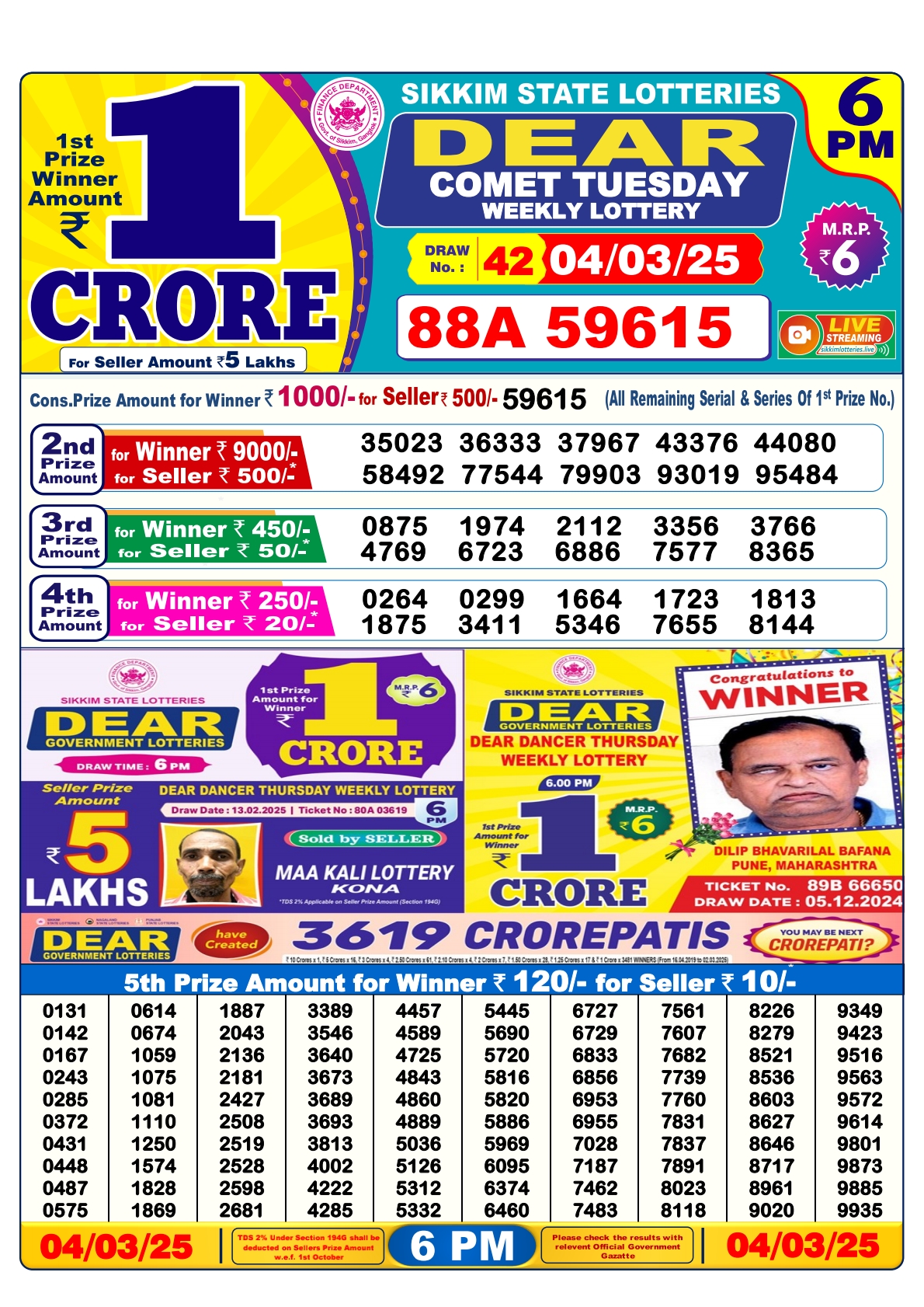Nagaland State Lotteries was established in the year 1972 under the supervision of the Finance Department to generate a dependable source of revenue for the State Government. Nagaland State Lottery is held every day of the week at three different times of the day, Morning, Day, and Evening. Every day, the lottery is held under a different name with some difference in the prize money with the top prize worth ₹1 Crore (including Super Prize amount). The daily lotteries hosted by Nagaland State include Dear Morning Lottery, Dear Day Lottery, and Dear Evening Lottery which costs 6 Rupees for each ticket.