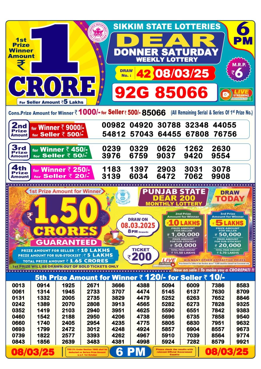 Nagaland State Lotteries was established in the year 1972 under the supervision of the Finance Department to generate a dependable source of revenue for the State Government. Nagaland State Lottery is held every day of the week at three different times of the day, Morning, Day, and Evening. Every day, the lottery is held under a different name with some difference in the prize money with the top prize worth ₹1 Crore (including Super Prize amount). The daily lotteries hosted by Nagaland State include Dear Morning Lottery, Dear Day Lottery, and Dear Evening Lottery which costs 6 Rupees for each ticket.