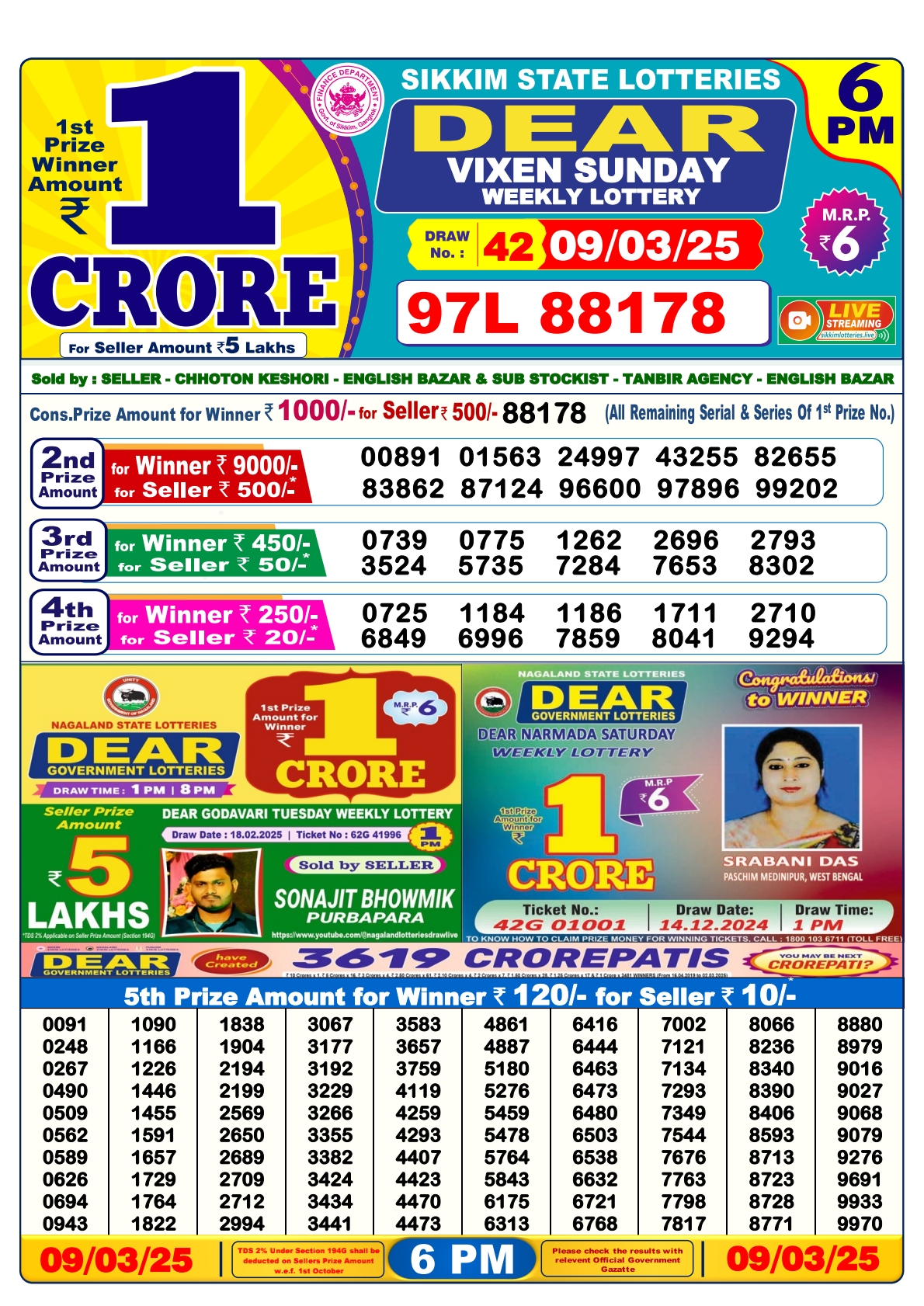 Nagaland State Lotteries was established in the year 1972 under the supervision of the Finance Department to generate a dependable source of revenue for the State Government. Nagaland State Lottery is held every day of the week at three different times of the day, Morning, Day, and Evening. Every day, the lottery is held under a different name with some difference in the prize money with the top prize worth ₹1 Crore (including Super Prize amount). The daily lotteries hosted by Nagaland State include Dear Morning Lottery, Dear Day Lottery, and Dear Evening Lottery which costs 6 Rupees for each ticket.