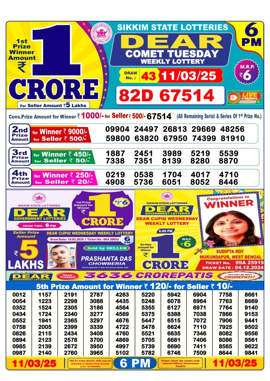 Nagaland State Lotteries was established in the year 1972 under the supervision of the Finance Department to generate a dependable source of revenue for the State Government. Nagaland State Lottery is held every day of the week at three different times of the day, Morning, Day, and Evening. Every day, the lottery is held under a different name with some difference in the prize money with the top prize worth ₹1 Crore (including Super Prize amount). The daily lotteries hosted by Nagaland State include Dear Morning Lottery, Dear Day Lottery, and Dear Evening Lottery which costs 6 Rupees for each ticket.